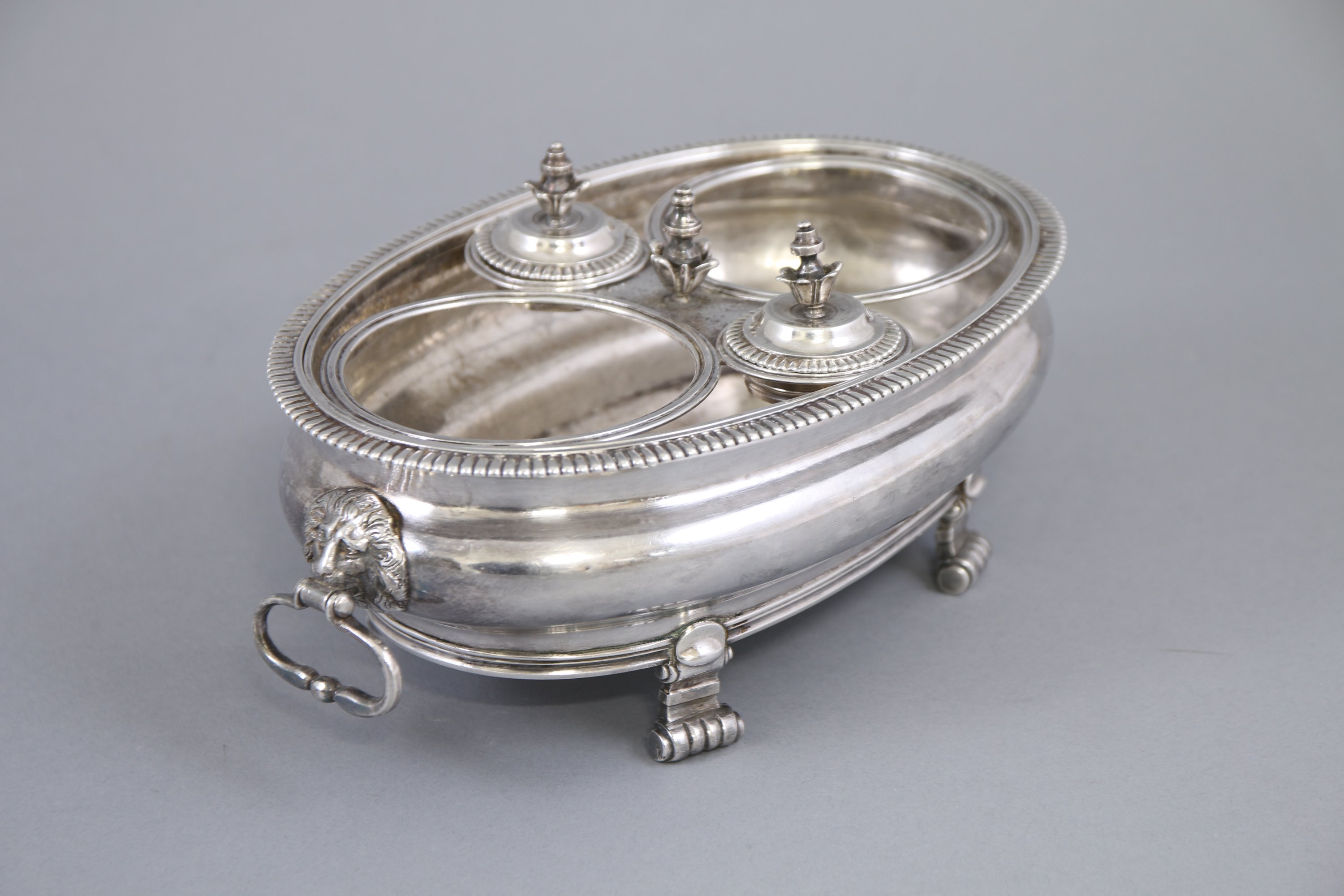 De forme ovale, le bord est souligné de denticules. Deux anneaux mobiles inscrits dans des mufles de lion. Il repose sur quatre pieds à enroulements.