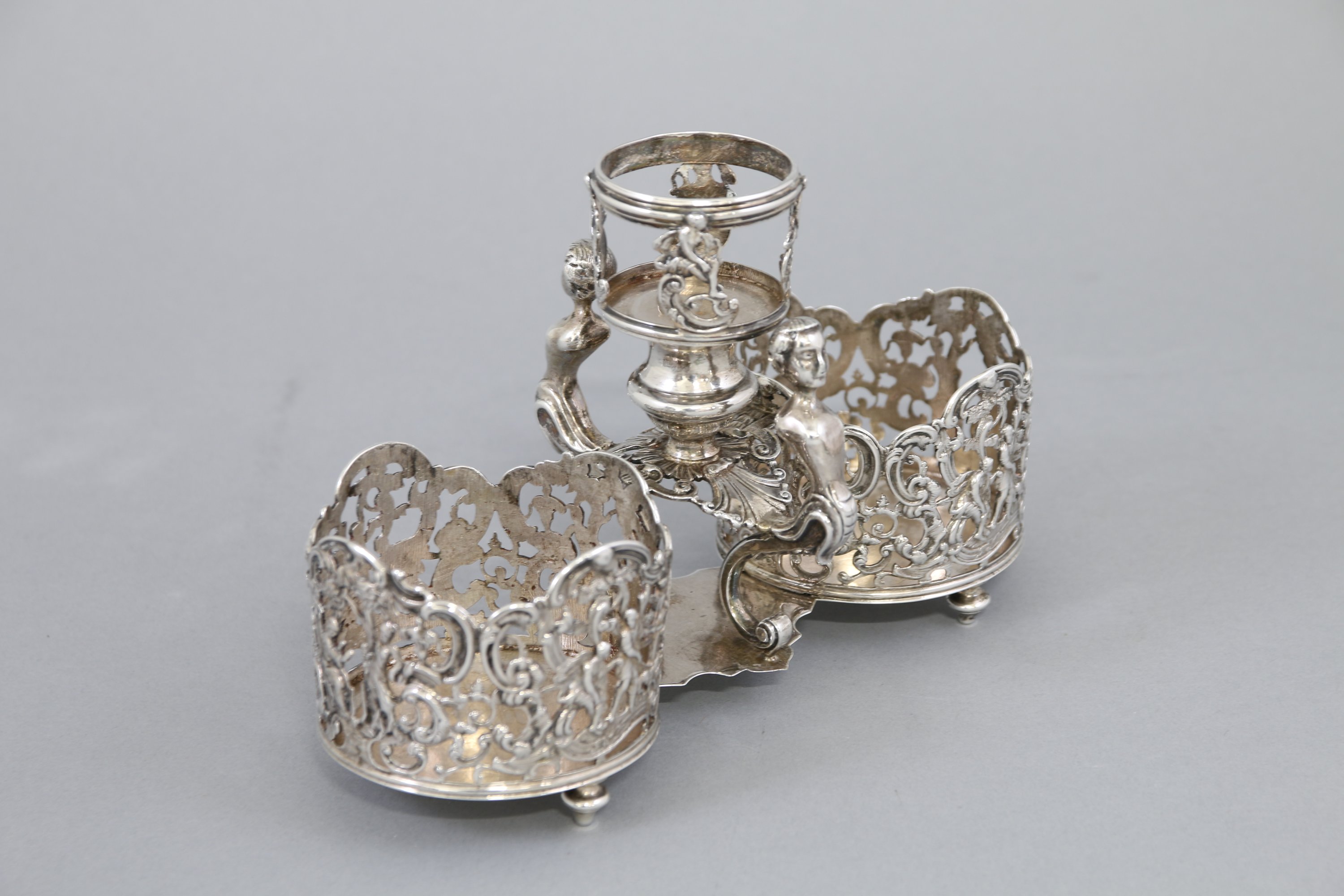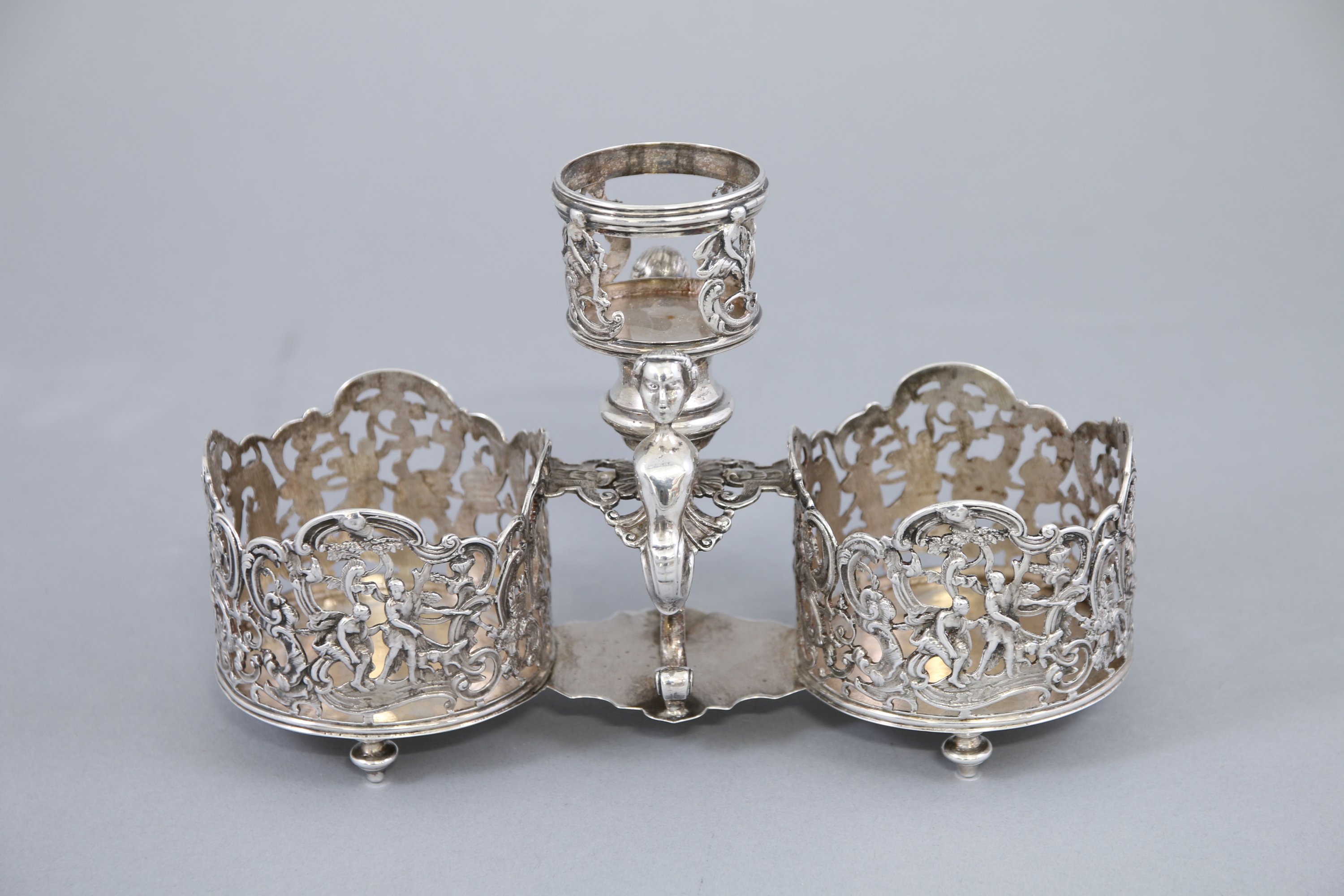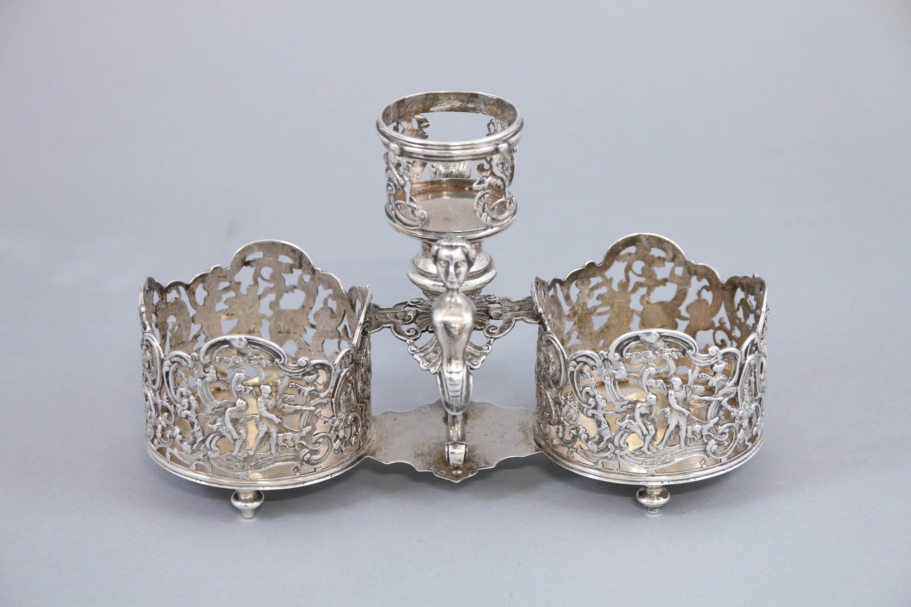 Monture d'huilier-vinaigrier en argent. Porte-burettes à décor ajouré de personnages, d’arbres et de rinceaux composés de C ; porte-bouchon cantonné de bustes engainés ; pieds toupies. Quatre poinçons incomplets.