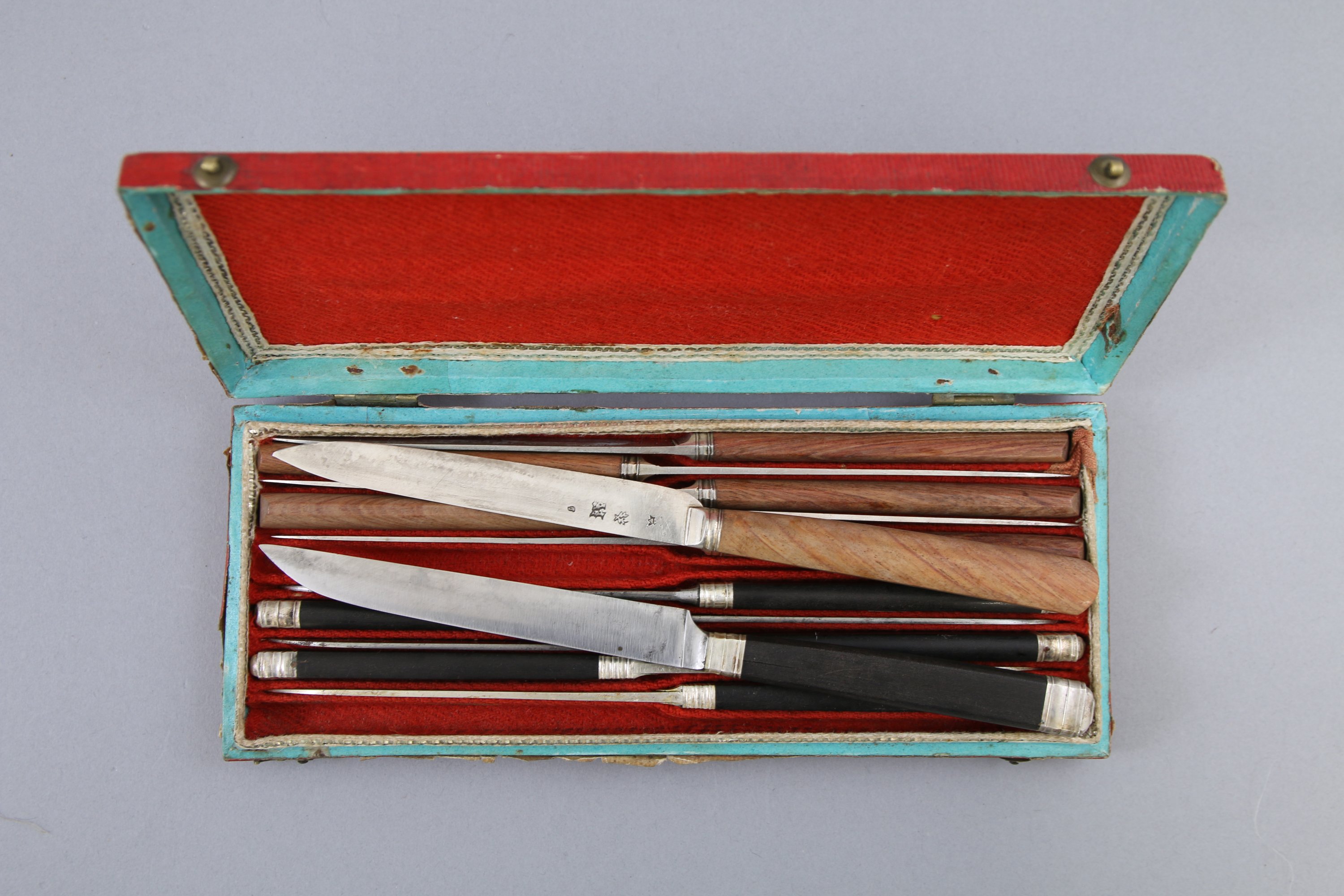 Six couteaux à manches en ébènes, dont deux à lames en argent et quatre à lames en acier, viroles, pommeau et et écusson "LL". orfèvre: Joseph Antoine (actif de 1799 à 1824), les autres marqués "Antoine avec un ciseau" proviennent vraisemblablement du même atelier.