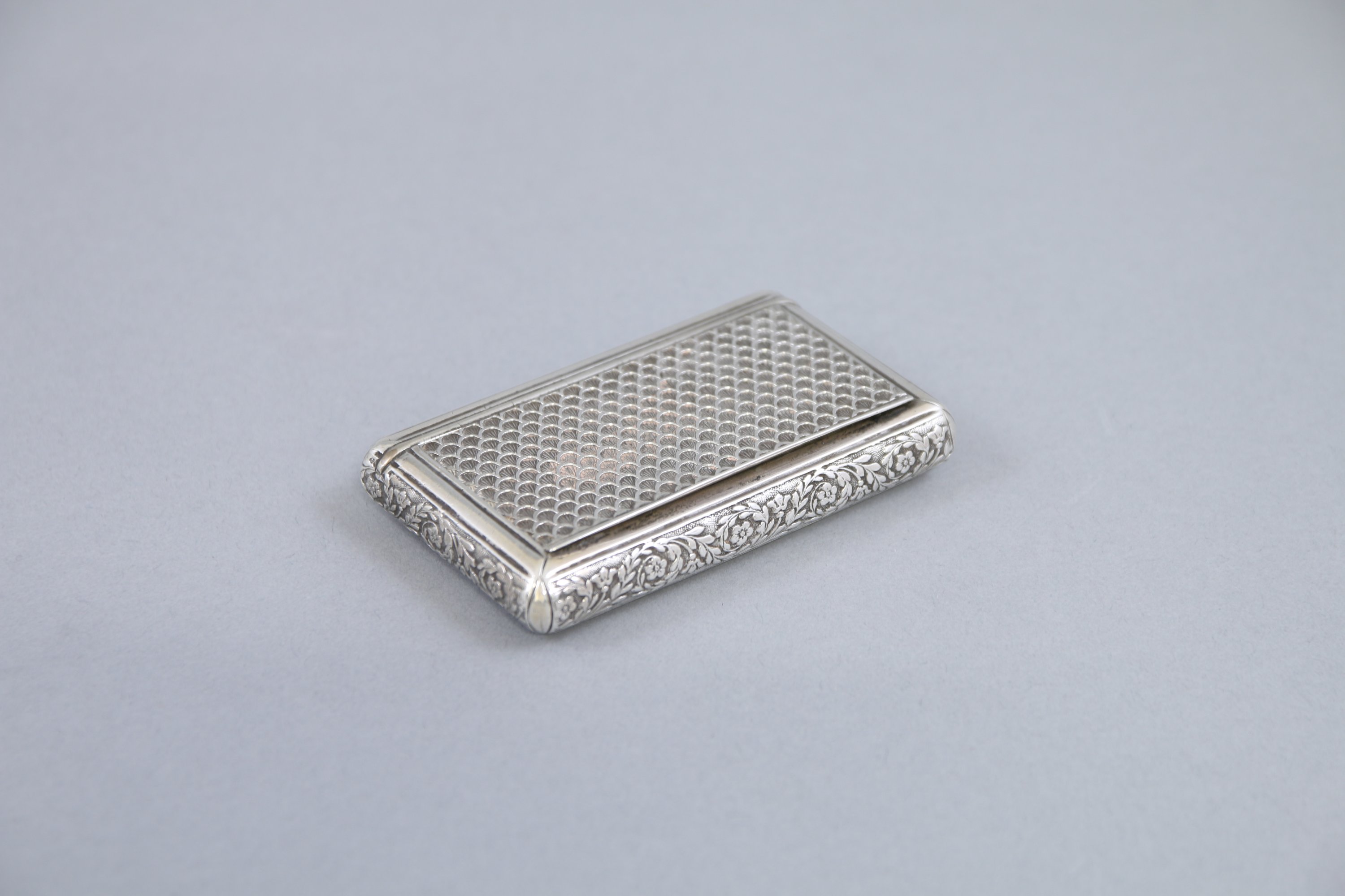 Le couvercle est décoré d'écaille, les côtés de guirlandes de fleurs et le revers de cannelures.