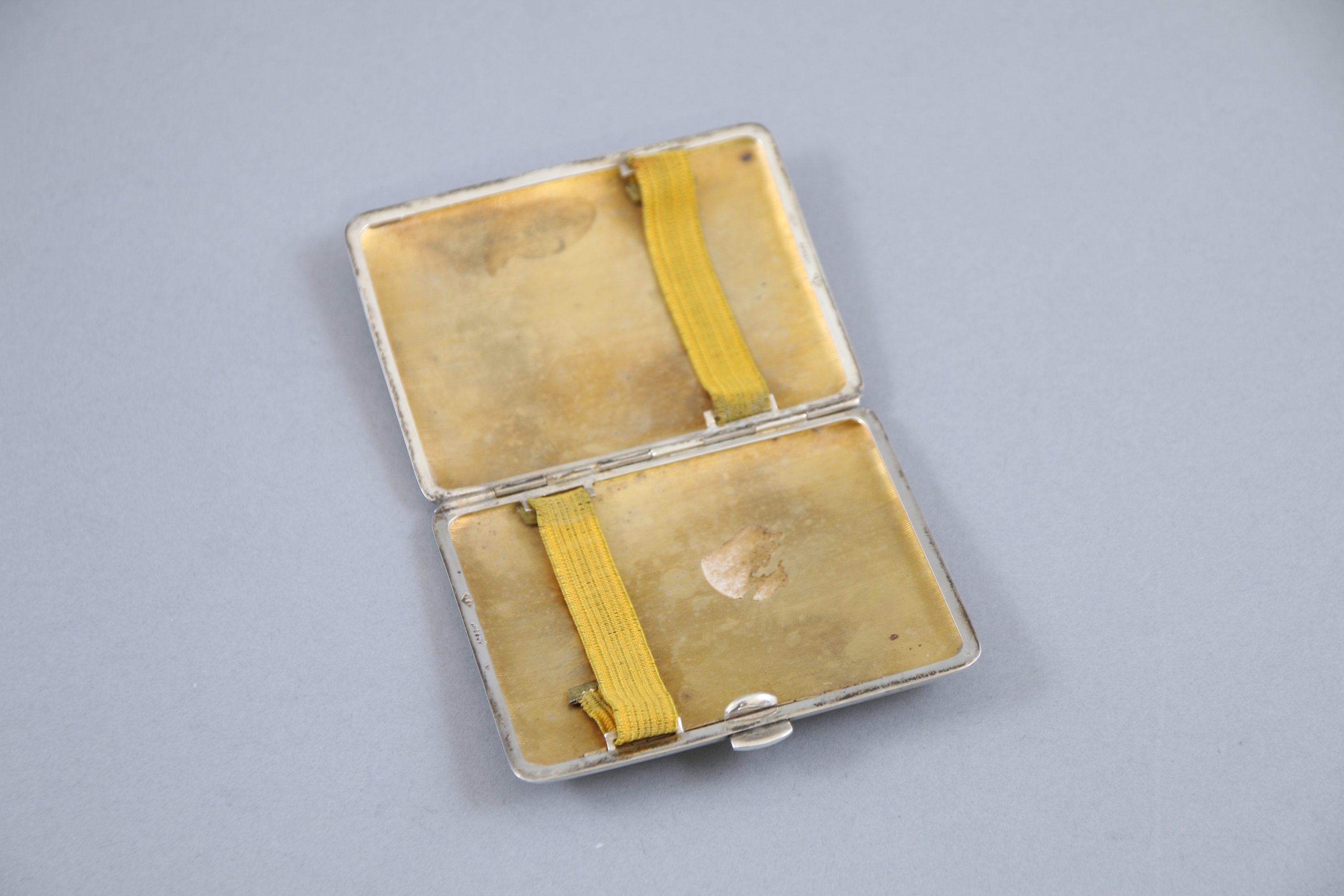 Joint: Etui à cigarette en argent à décor guilloché et intérieur doré. Poinçon tête de sanglier. Orfèvre non identifié "EF avec une fève". Poids: 78,6 g.