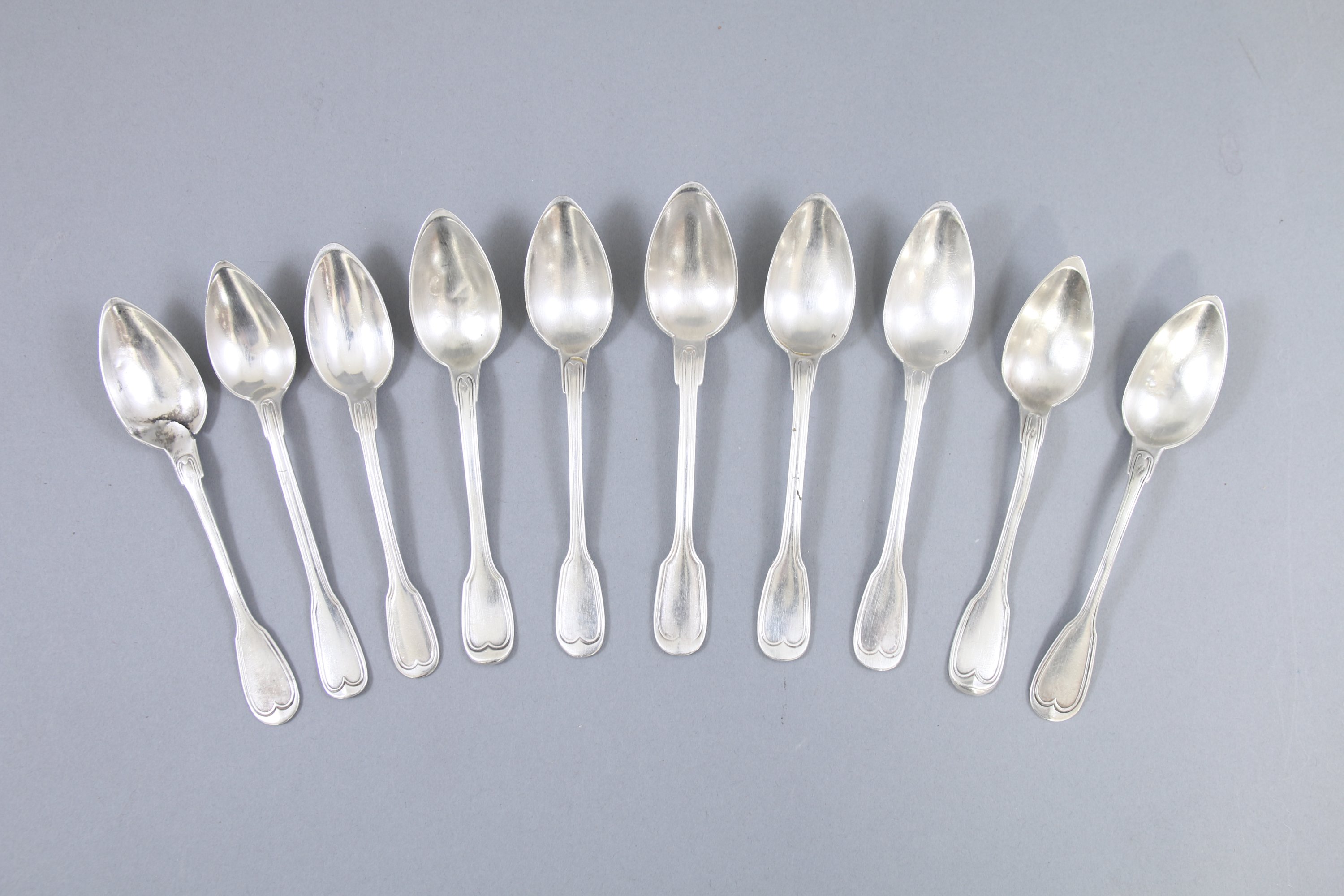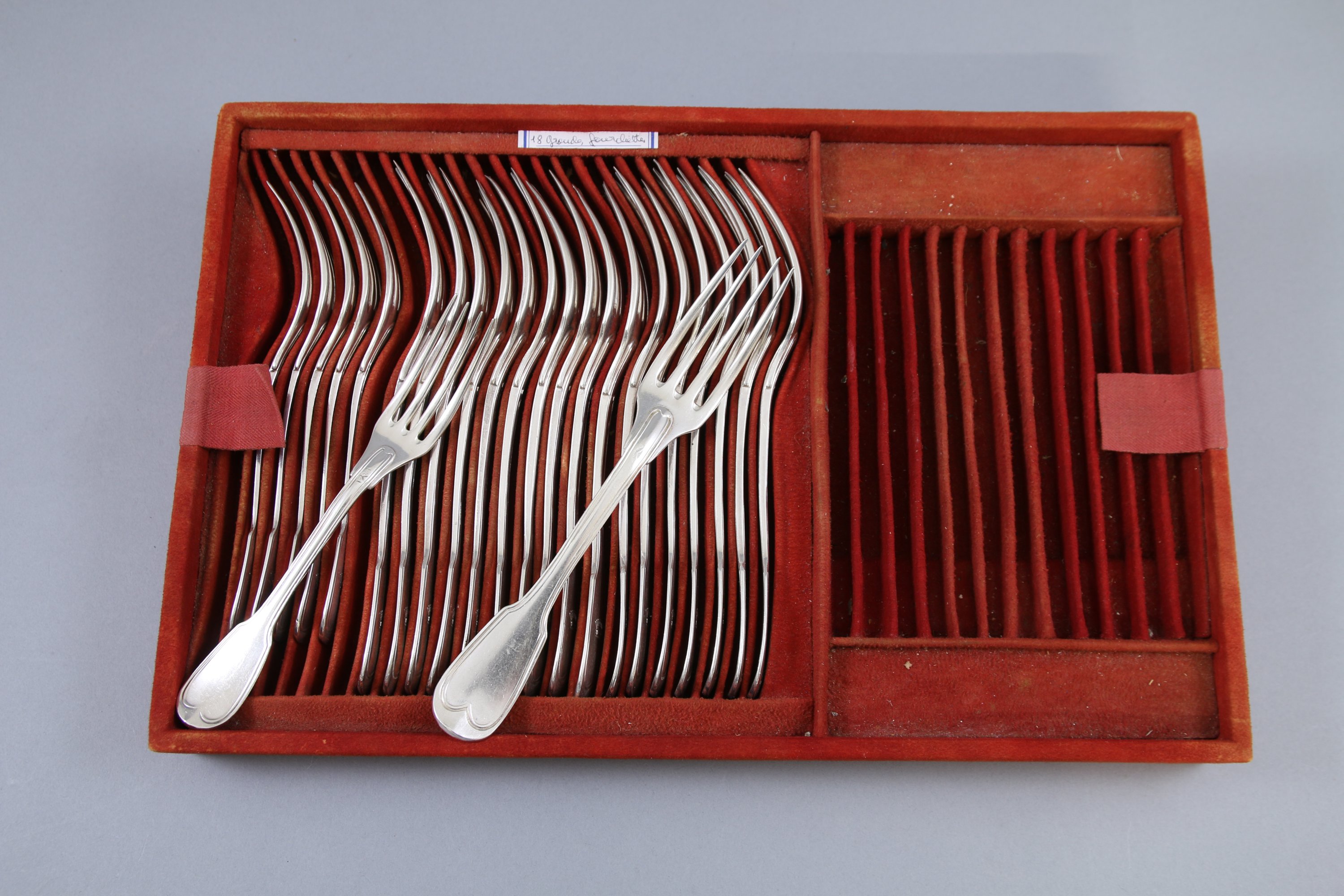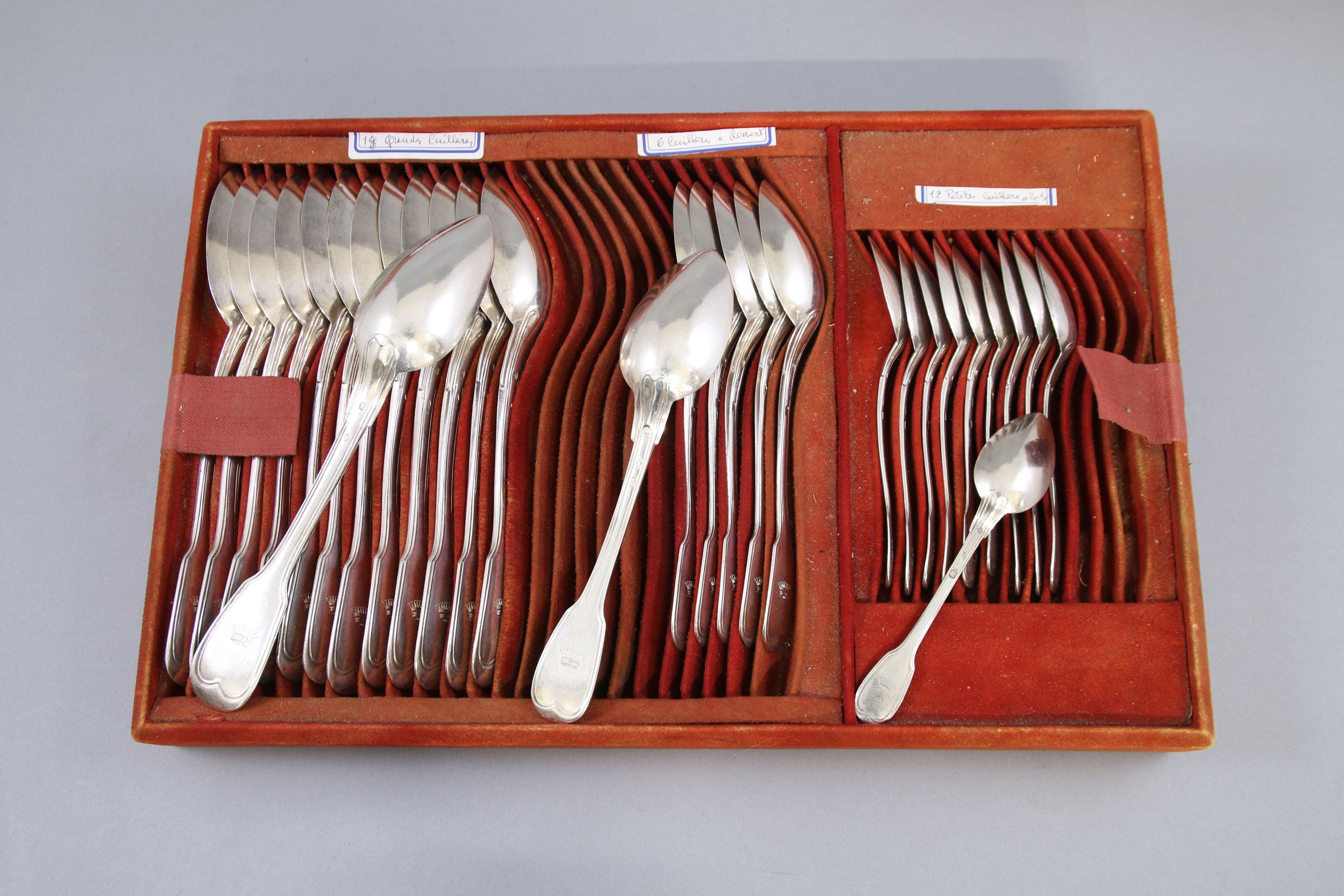 Modèle à filets-contours comprenant 18 fourchettes de table, 13 cuillers de table, 6 couverts à entremets, 9 cuillers à café et une cuiller à moka. La plupart des pièces gravées d'une couronne comtale.