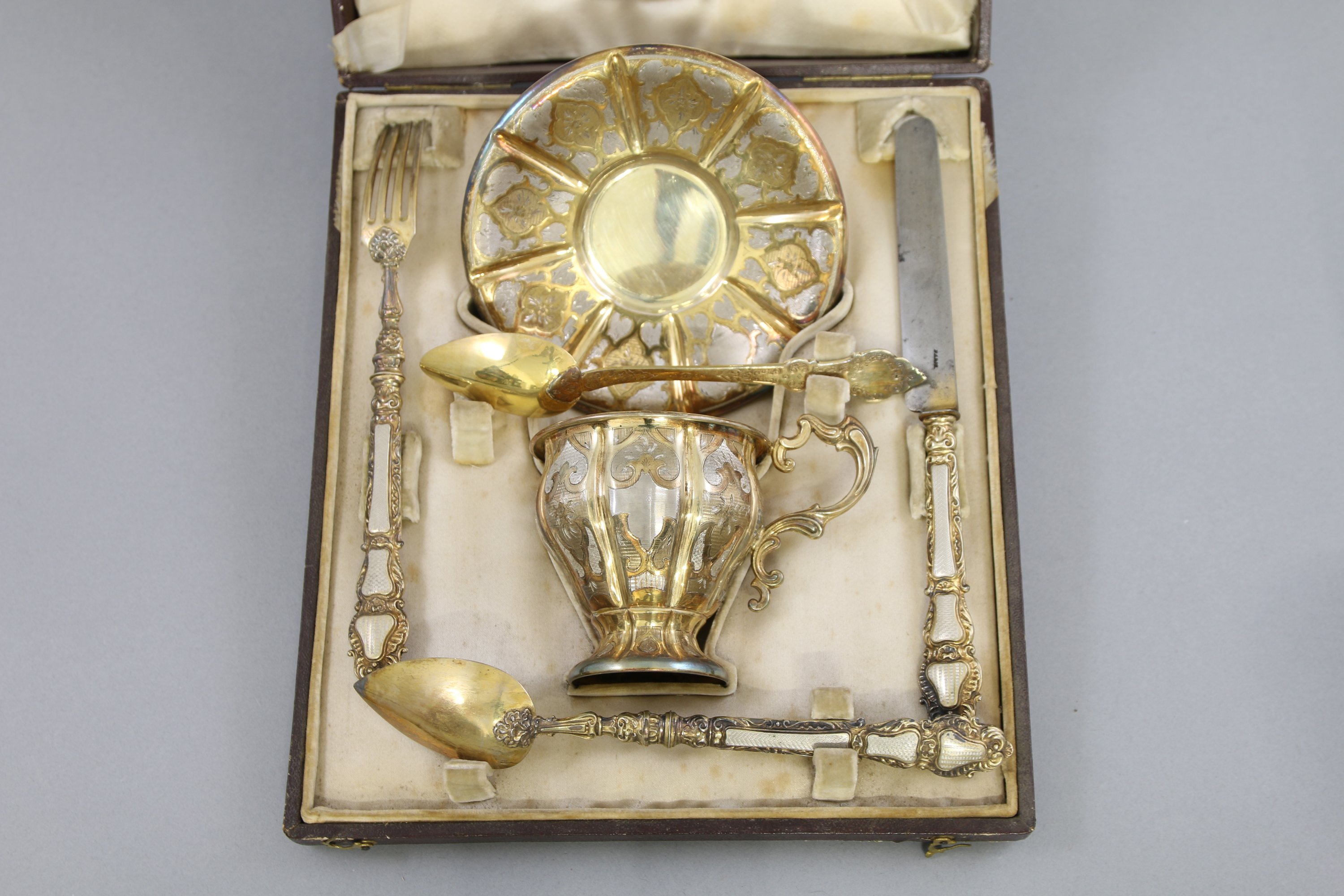 Comprenant une tasse et sa soucoupe, un couvert, une petite cuiller et un couteau à lame acier. Manches en argent fourré.