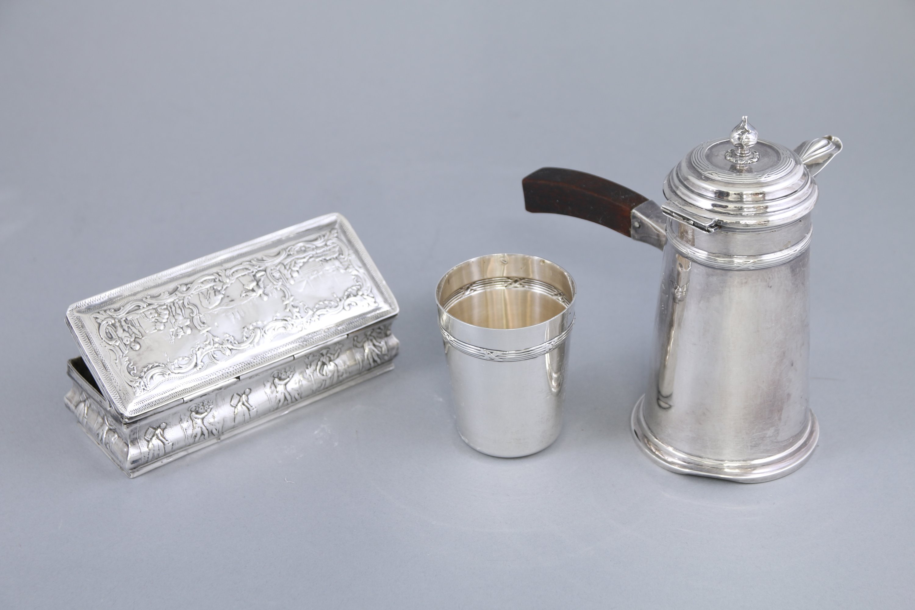 Joint: Boite à cigares en argent à motifs de scènes de vendanges, de pêches et de fêtes bachiques. Haut. 3,8 Larg. 15 Prof. 6,3 cm. Poids: 178 g.