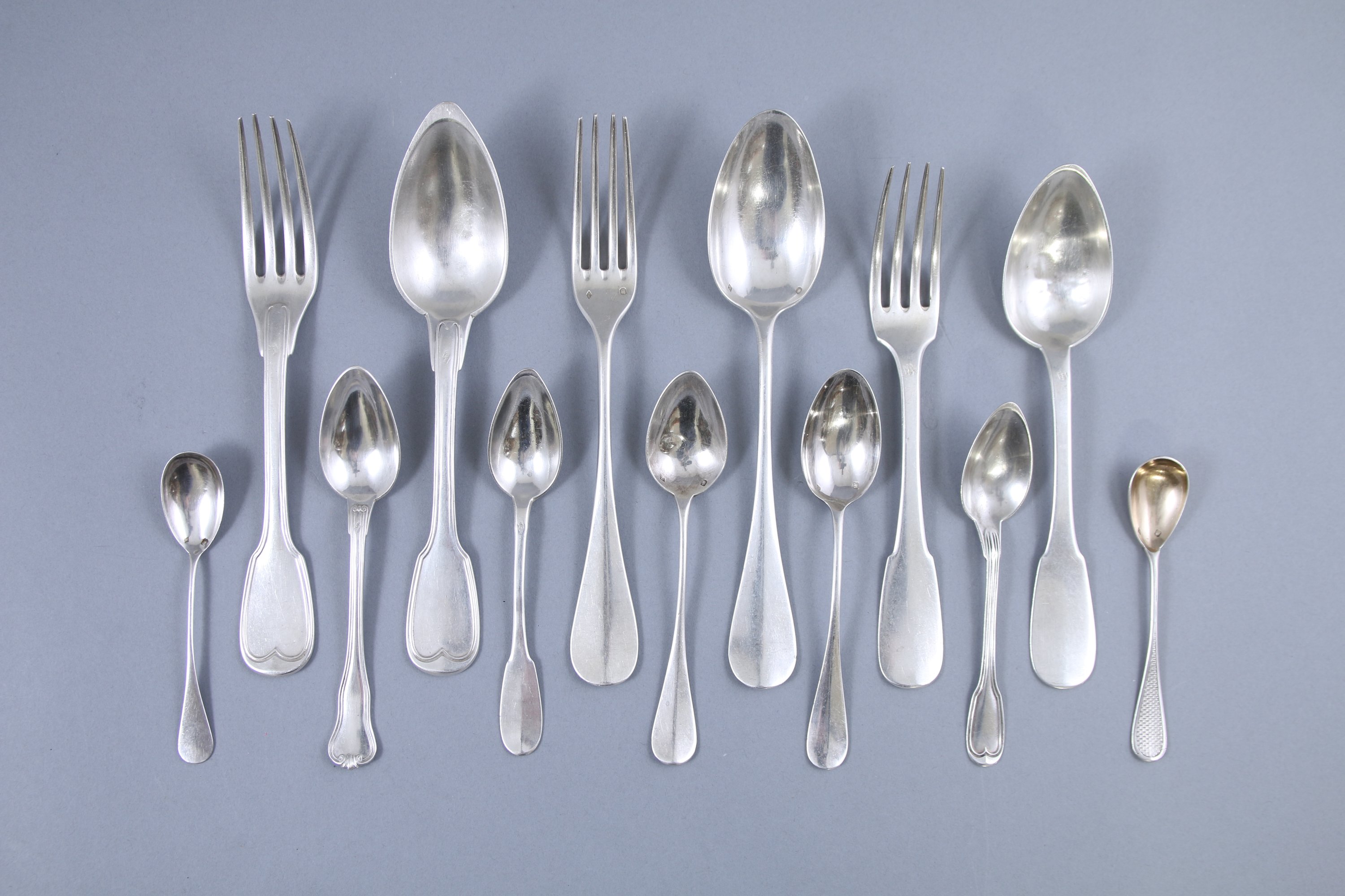 De modèles variés dont uniplat, filets-contours et médaillons. Certaines pièces monogrammées.