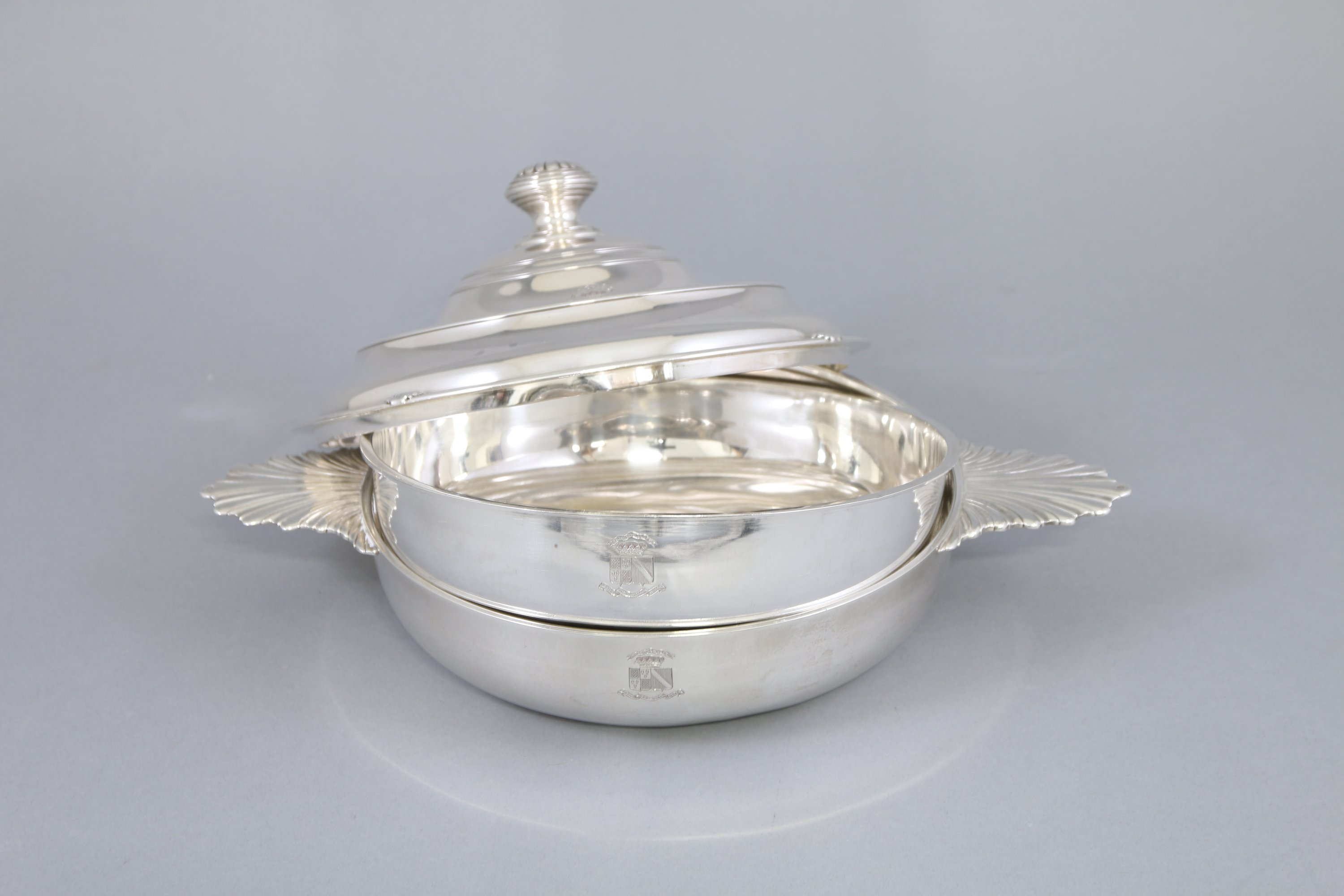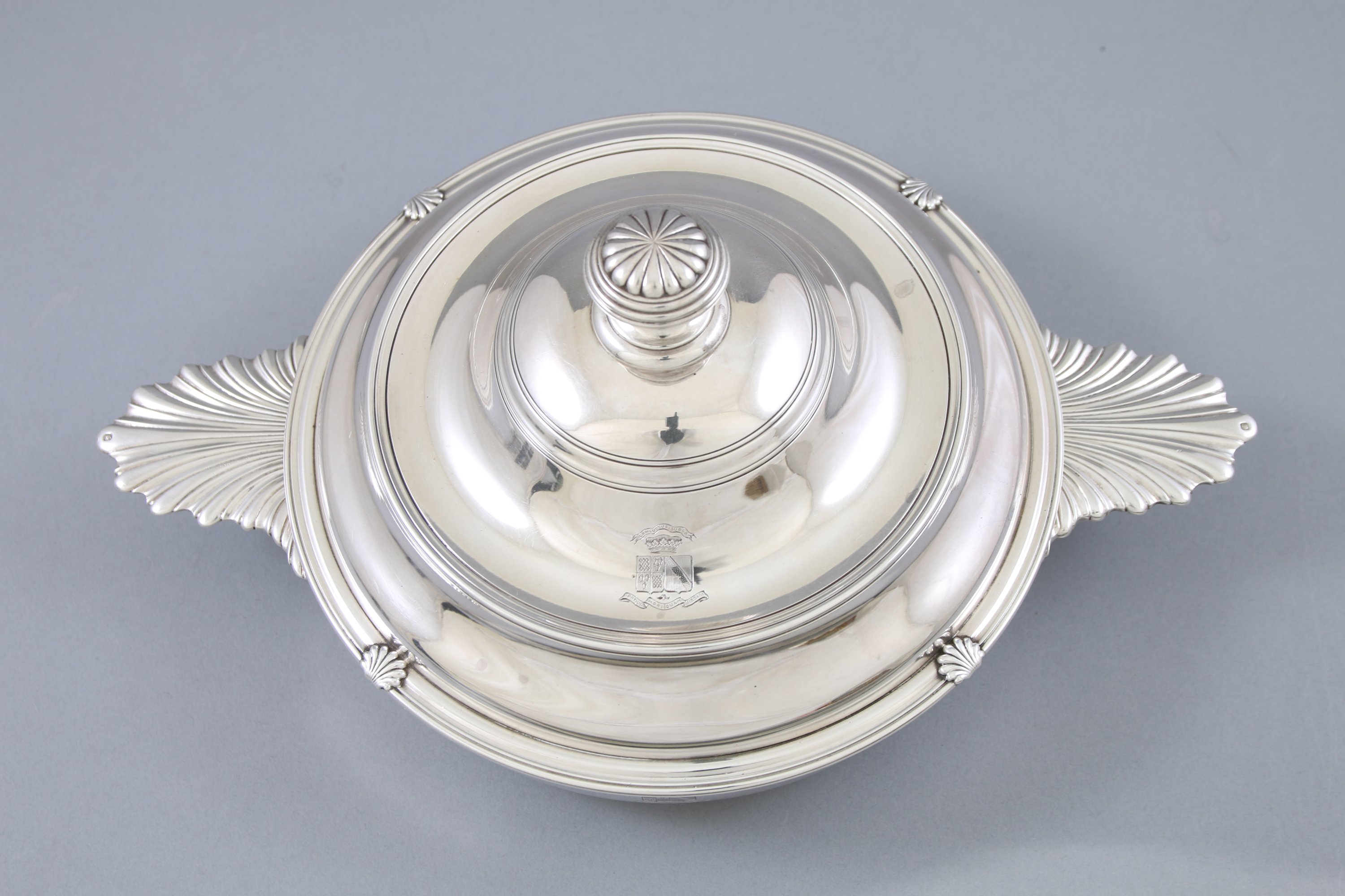 Modèle filet coquille. Le couvercle sommé d'un fretel à décor de godrons est gravé aux armes d'alliance de la famille Rohan-Chabot et de la famille d'Hénin-Liétard. Les prises en feuille.