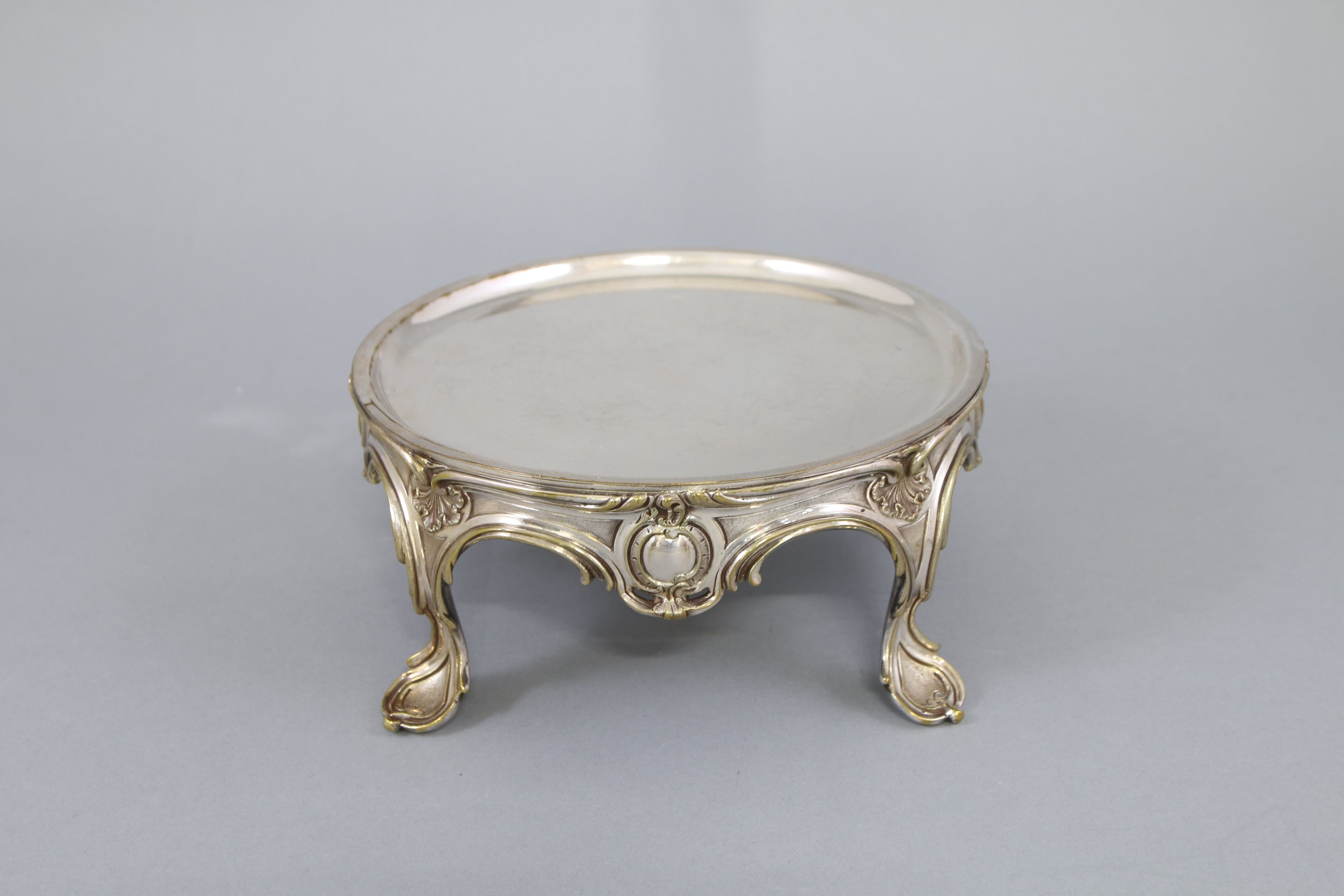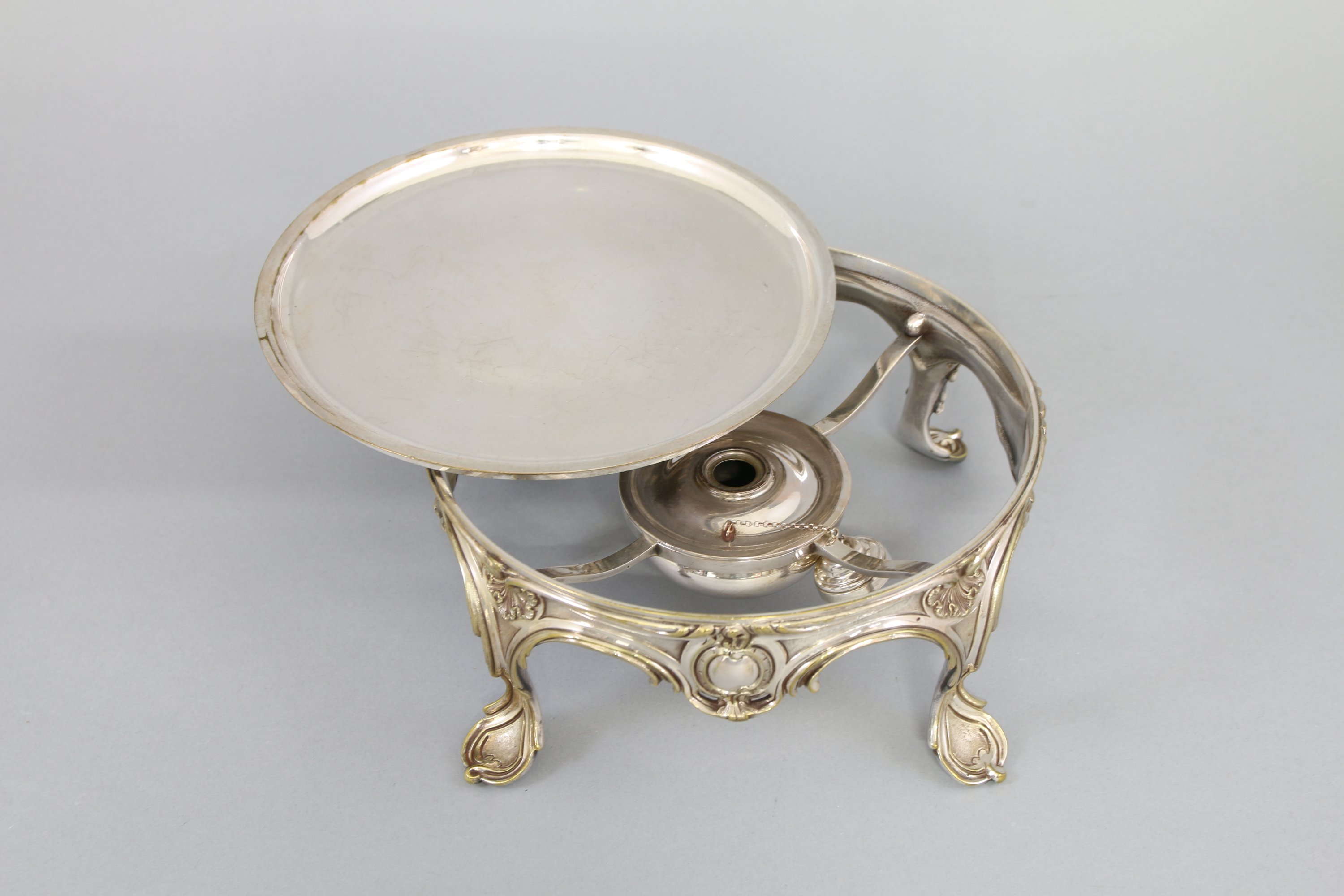 Joint: réchaud en métal argenté de style Louis XV à décor de cartouches et coquilles. Il repose sur quatre pieds à motifs de feuilles d'acanthes. Haut. 10 Diam. 22,5 cm