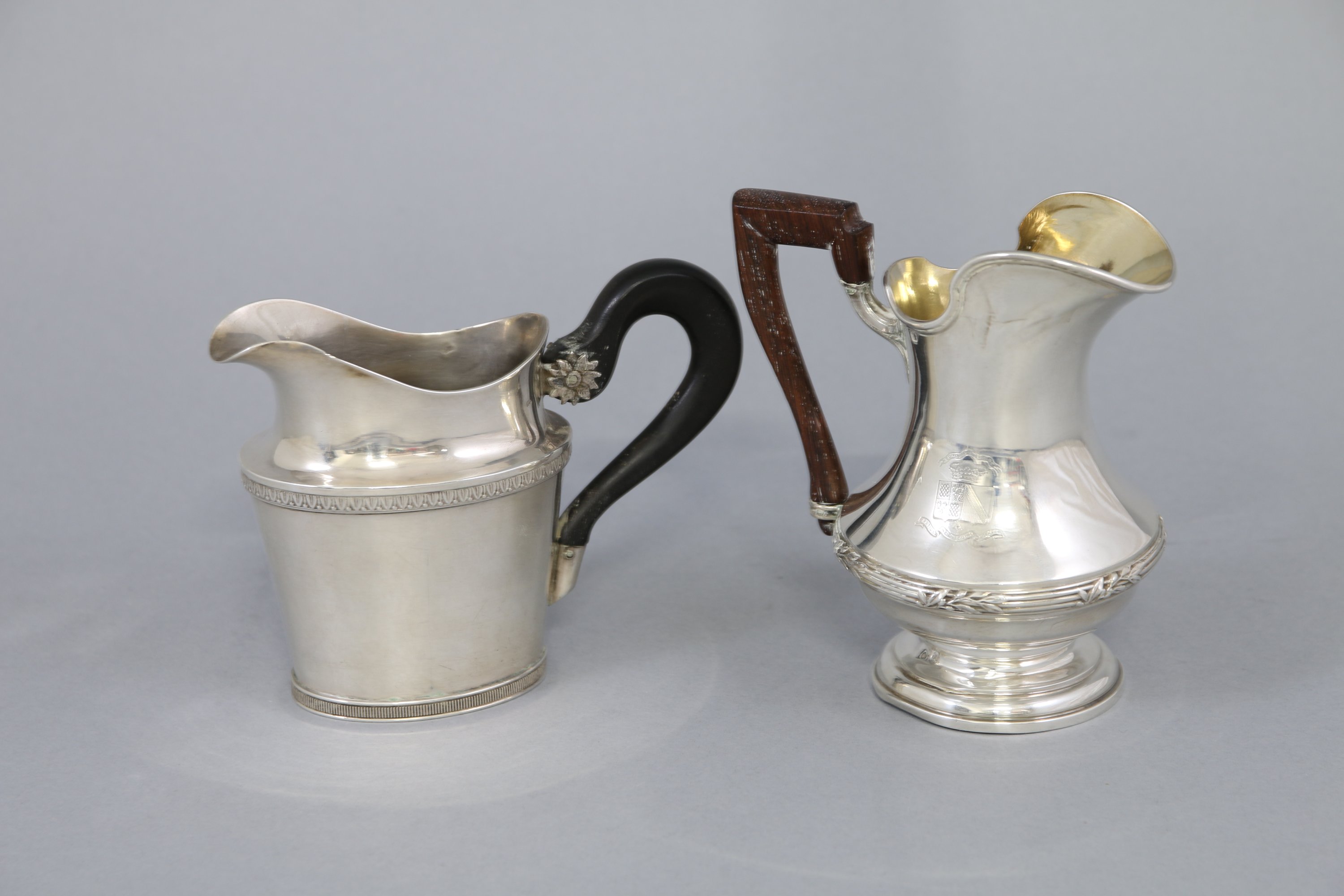 Le premier à anse en palissandre. La lèvre soulignée d'une moulure, la panse décorée de joncs rubannés et gravée des armes d'alliances de la famille Rohan-Chabot et de la famille Hénin-Liétard. Intérieur en vermeil. Numérotée "1658" au revers.