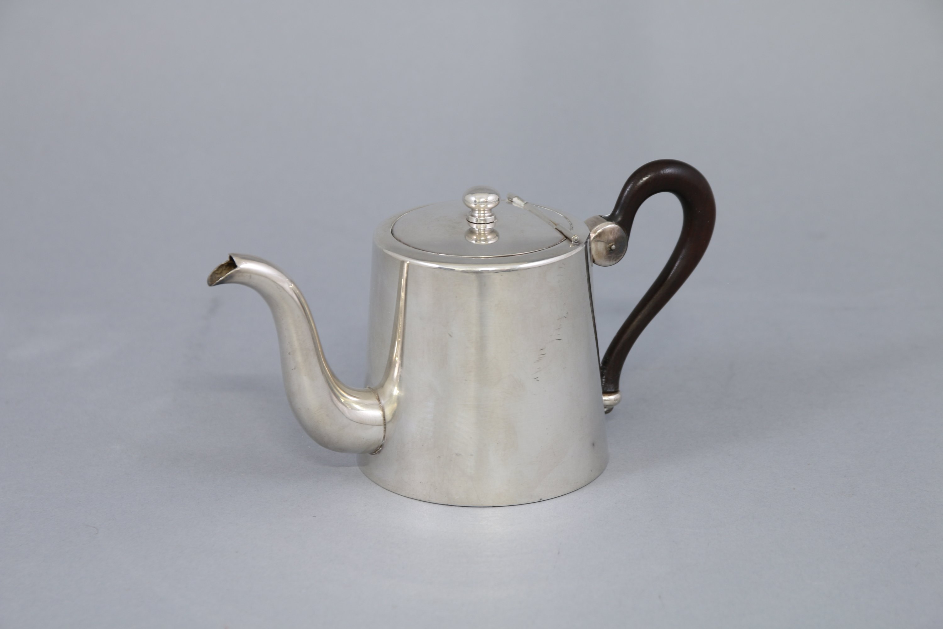 Joint: Théière égoiste en métal argenté de style Art déco à l'anse en bois noircie et le bec en col de cygne. Numérotée "10" au revers.