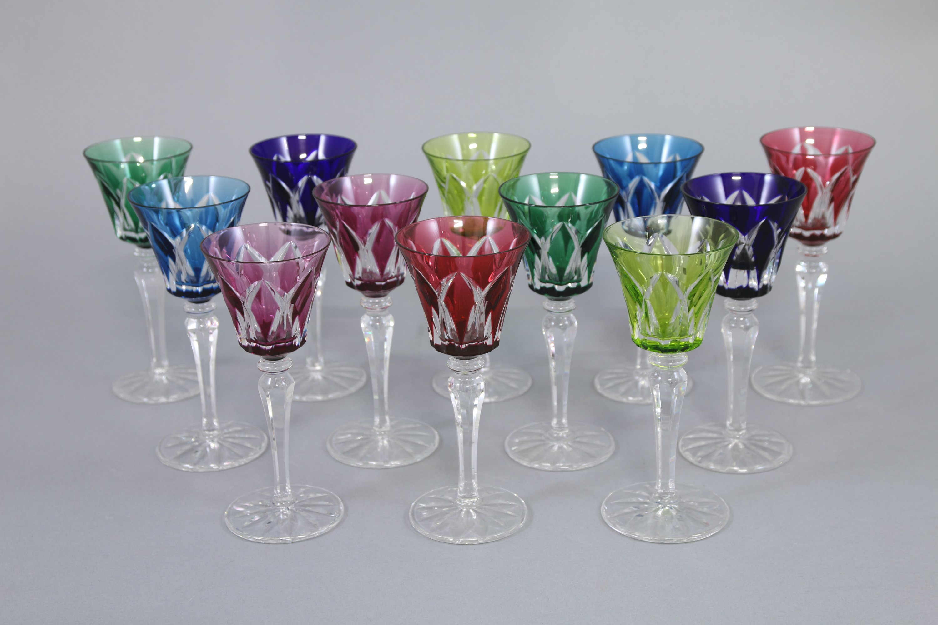 Composé de 12 verres à vin du Rhin - couleur chartreuse (2), bleu foncé (2), rouge (1), rose (3), bleu clair (2) et vert (2) - quatre verres à eau, neuf verres à vin rouge, 11 verres à vin blanc, 12 verres à liqueur - couleur rose (2), rouge (2), vert (2), bleu foncé (2), bleu clair (2) et chartreuse (2) - et une carafe.