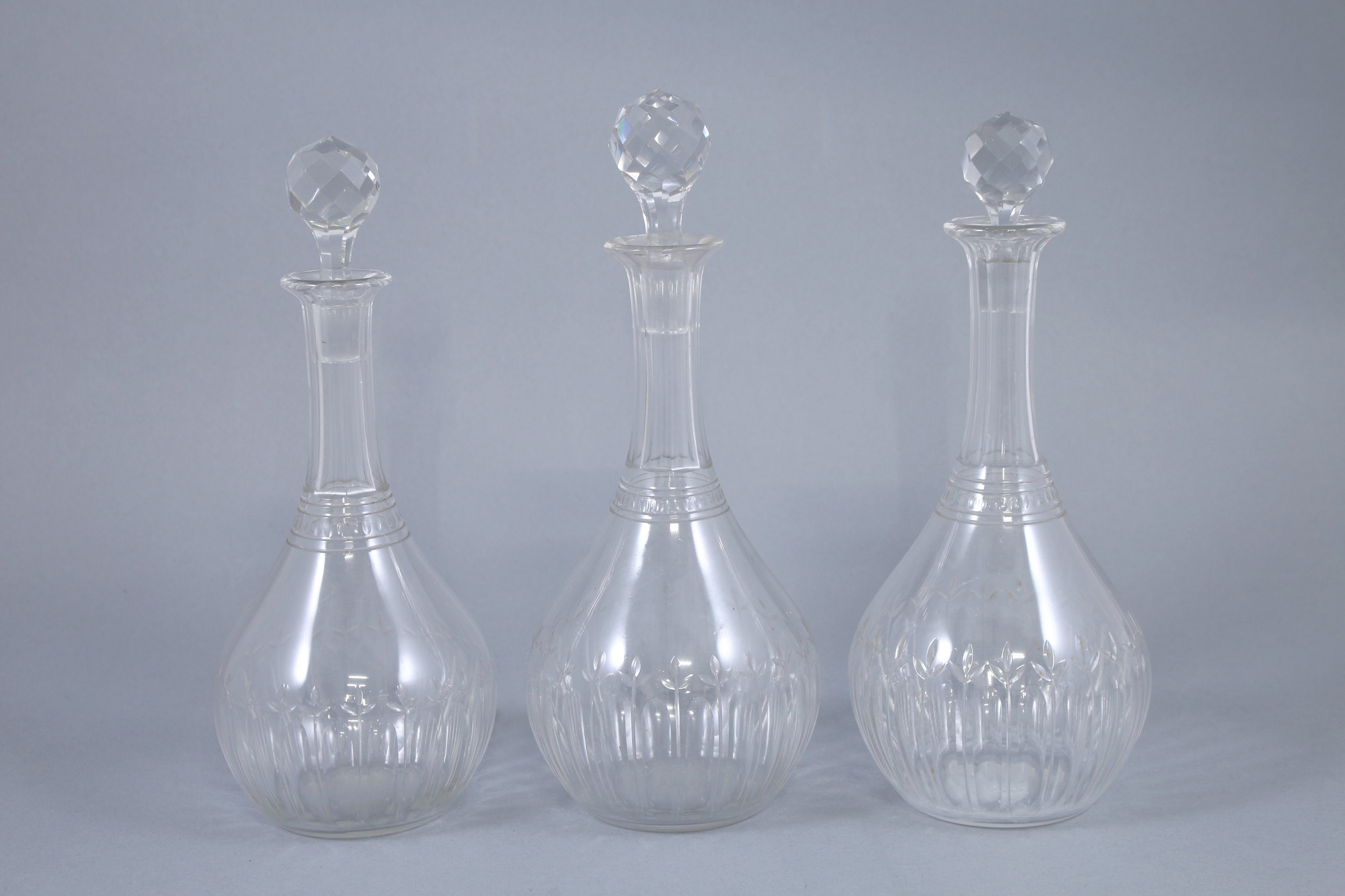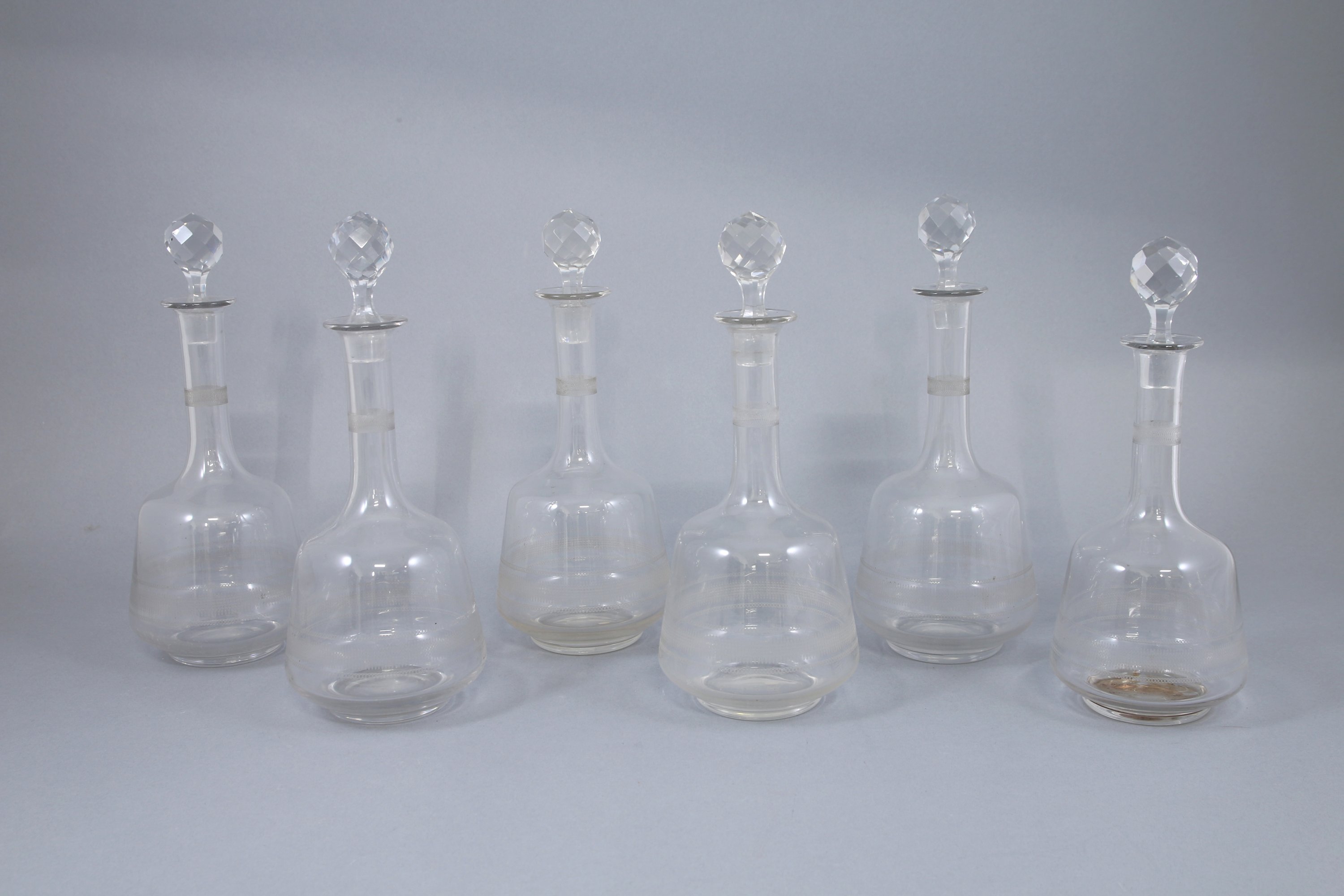 - Saint-Louis. Six carafes en cristal à double décor gravé. Une avec une étiquette. Haut. 28,5 cm. pour une et 31 cm. pour cinq.