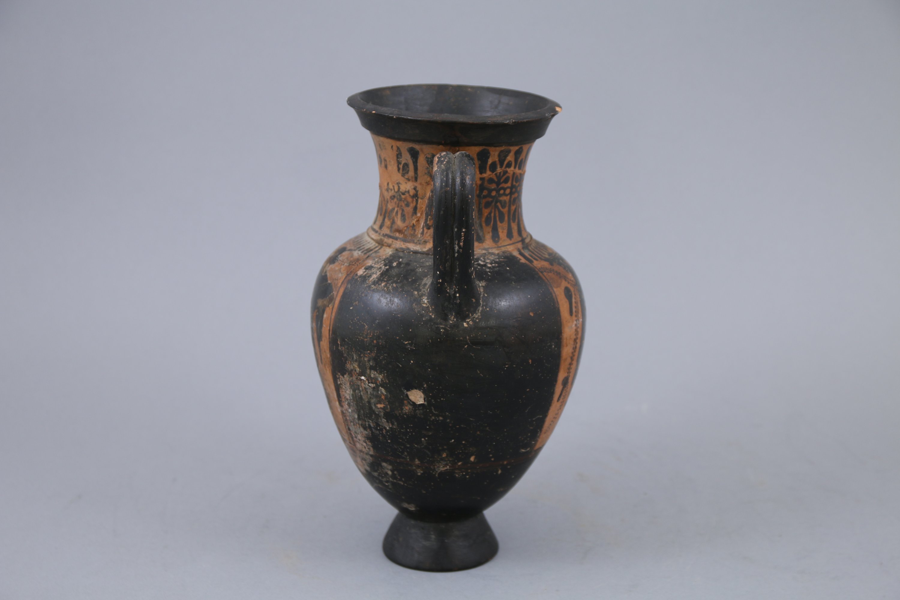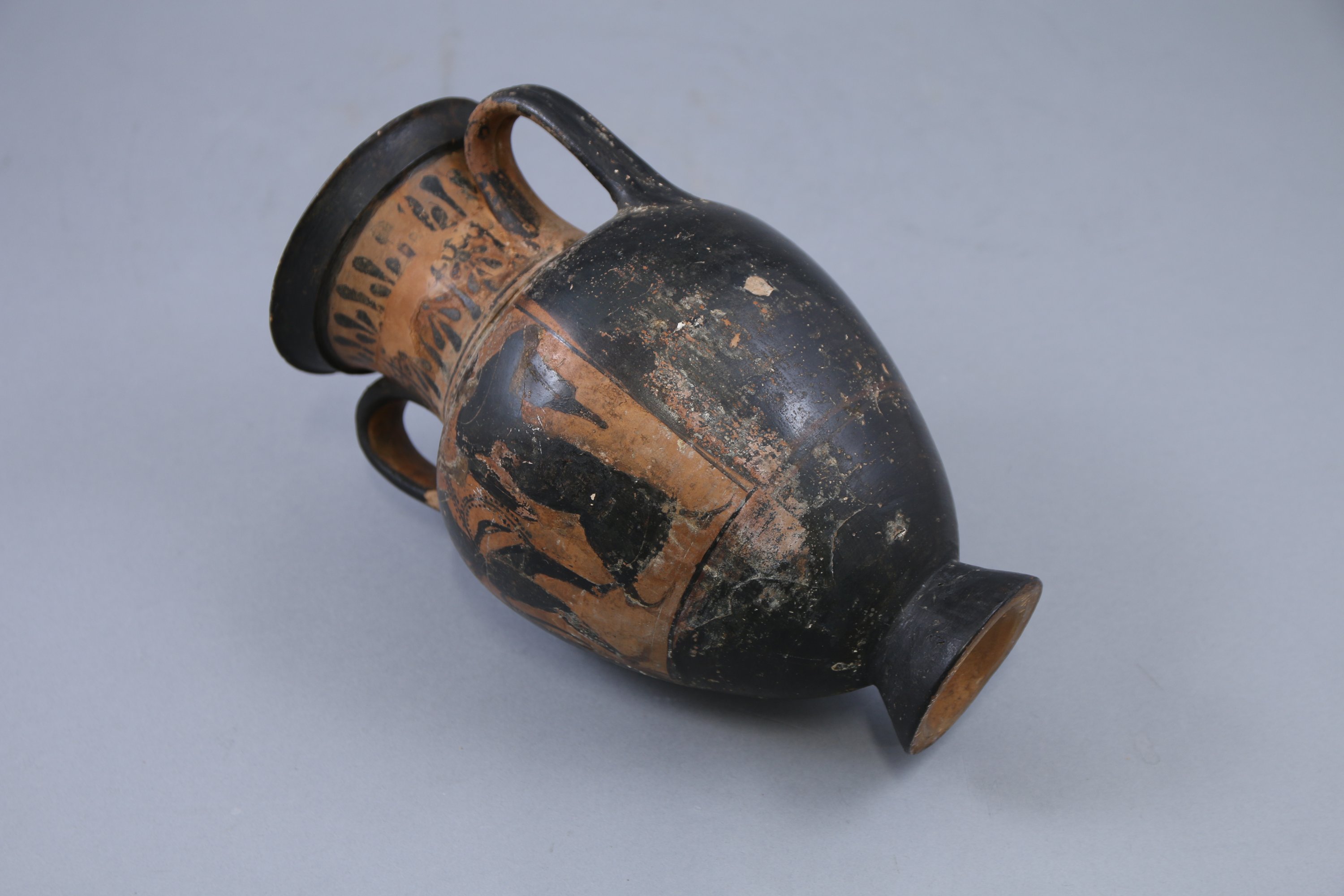Décor de palmettes sur le col et de scènes dionysiaques sur la panse: A/ Dionysos assis tenant une coupe. B/ Satyre poursuivant une ménade.