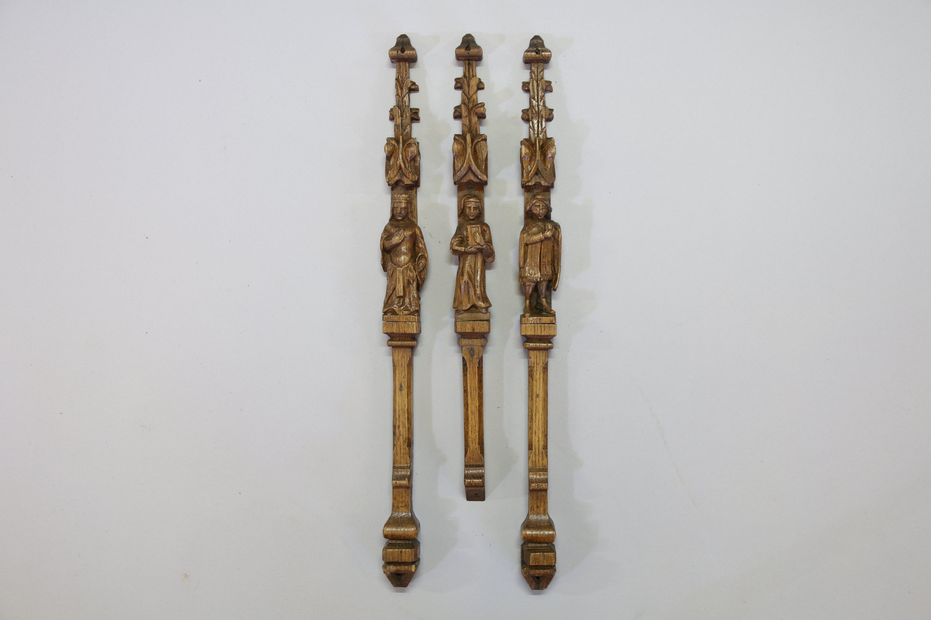Joint: Trois contreforts néo-gothique en chêne sculpté de personnages burlesques, une femme et deux hommes. Haut. environ 54 cm. (accidents et manques).