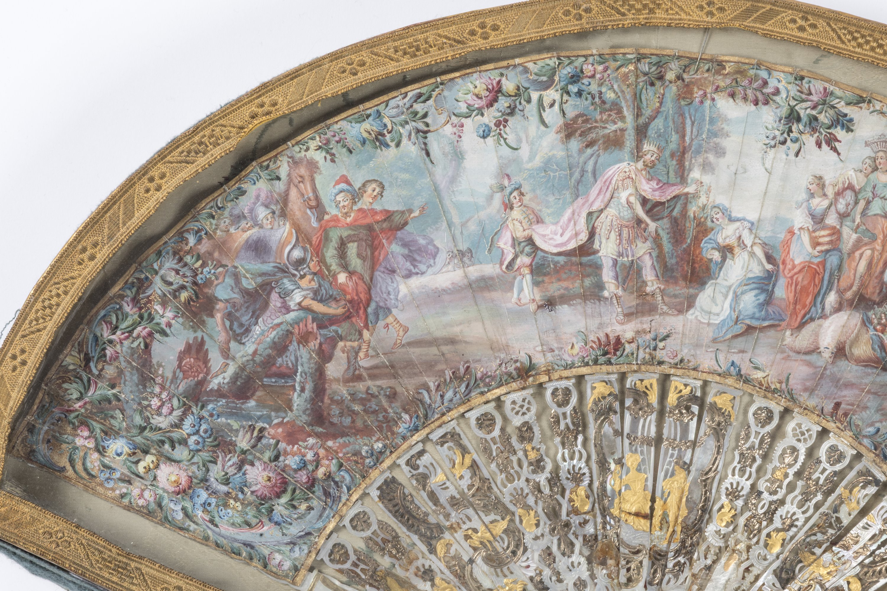A painted paper and mother-of-pearl fan depicting the meeting between King Solomon and the Queen of Sheba. Paris or Versailles, ca. 1740.