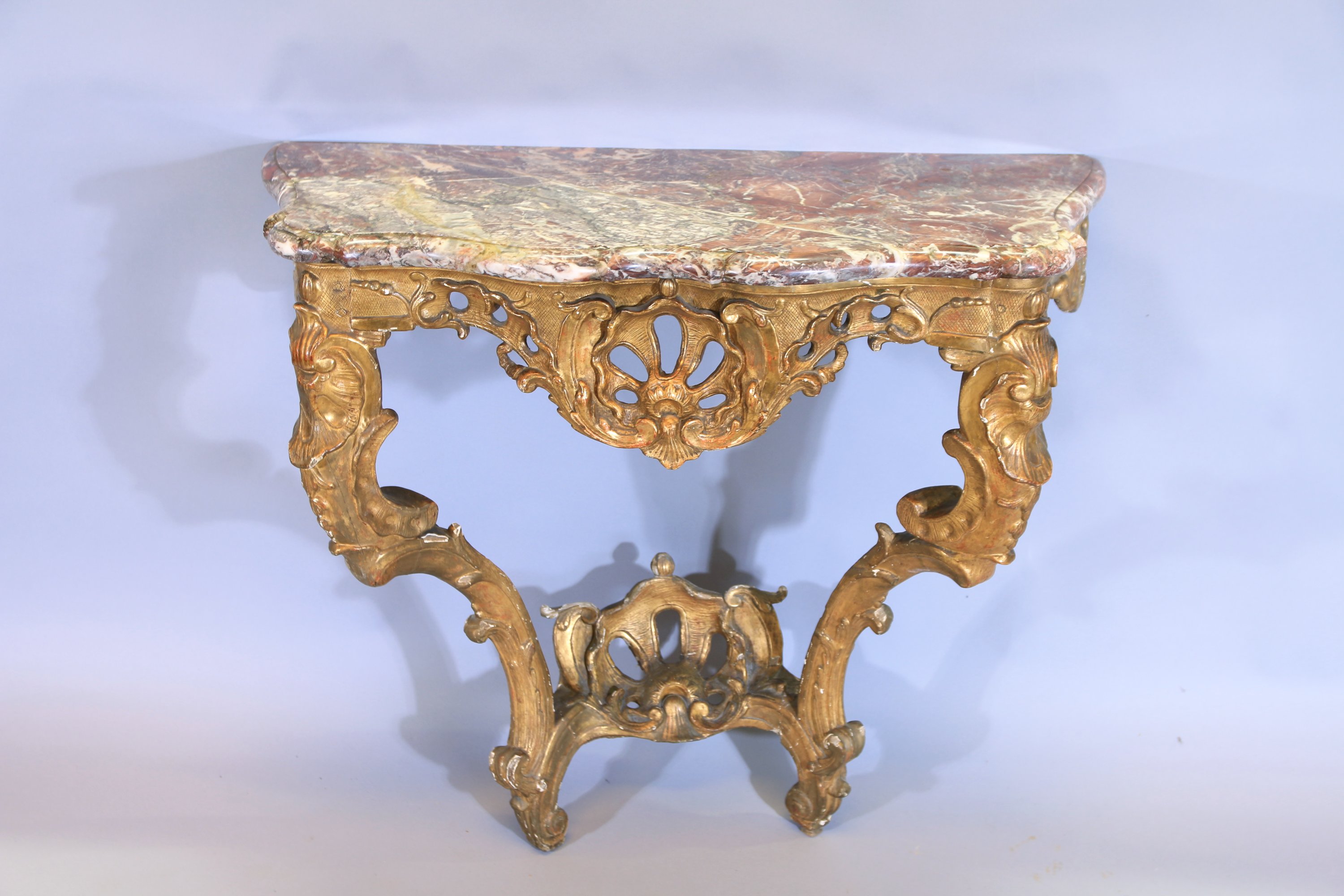 A riche décor en partie ajouré de rinceaux coquilles et acanthes sur fond de treillages. Pieds cambrés reliés par une entretoise ornée d'une coquille stylisée et ajourée.
