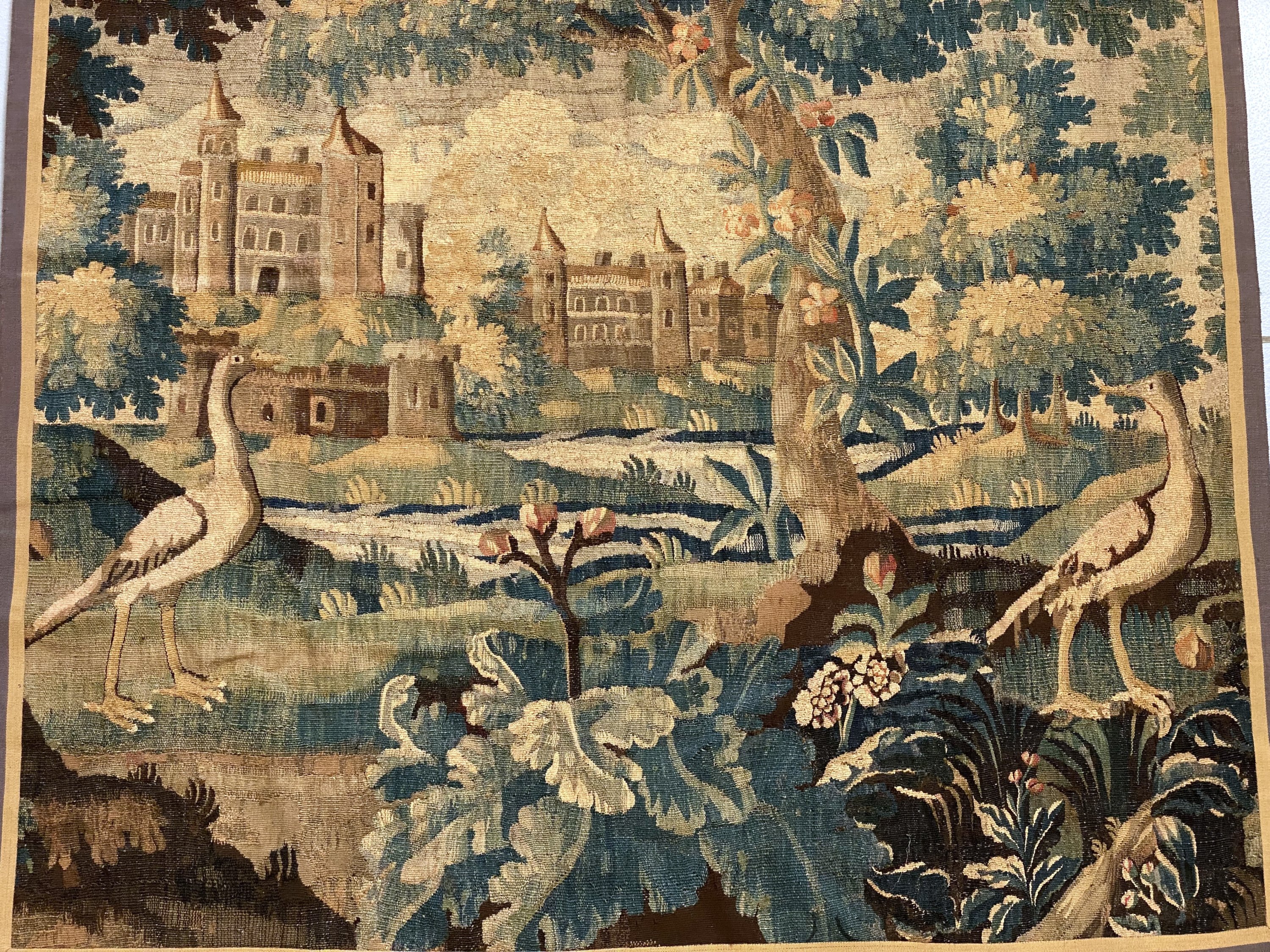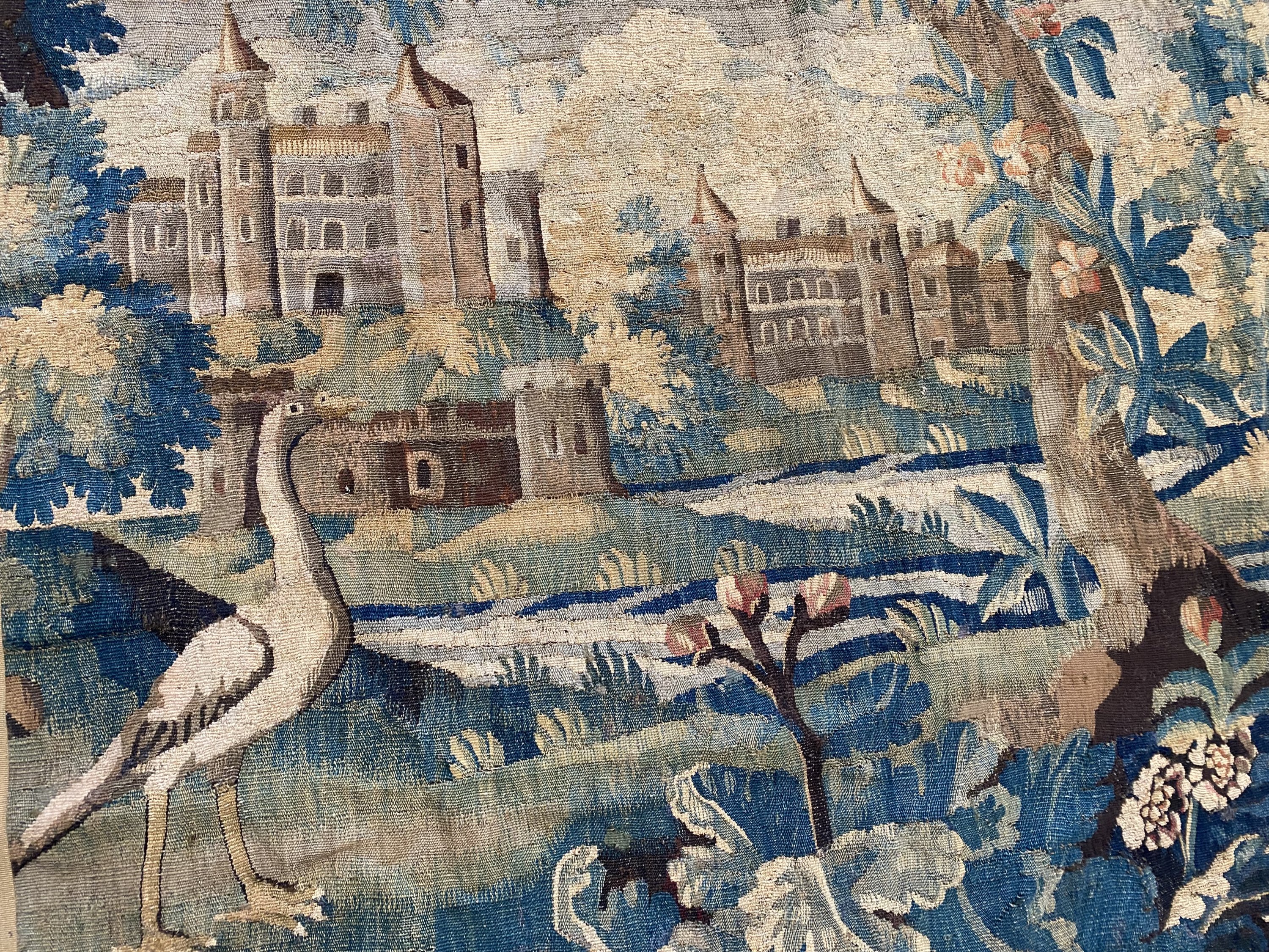 Verdure à la rivière, château et oiseaux.
