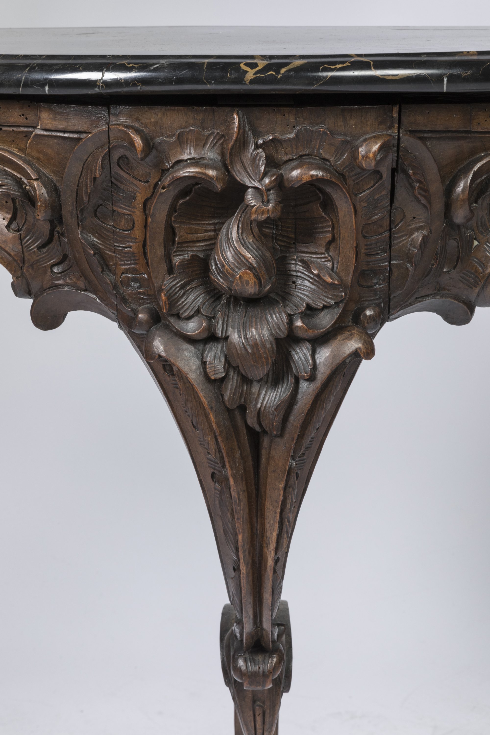 De forme demi-lune, elle présente une ceinture richement décorée d'un fruit et torsadée sur fond de coquille et rinceaux végétaux. Elle repose sur un pied cambré terminé par une feuille d'acanthe.