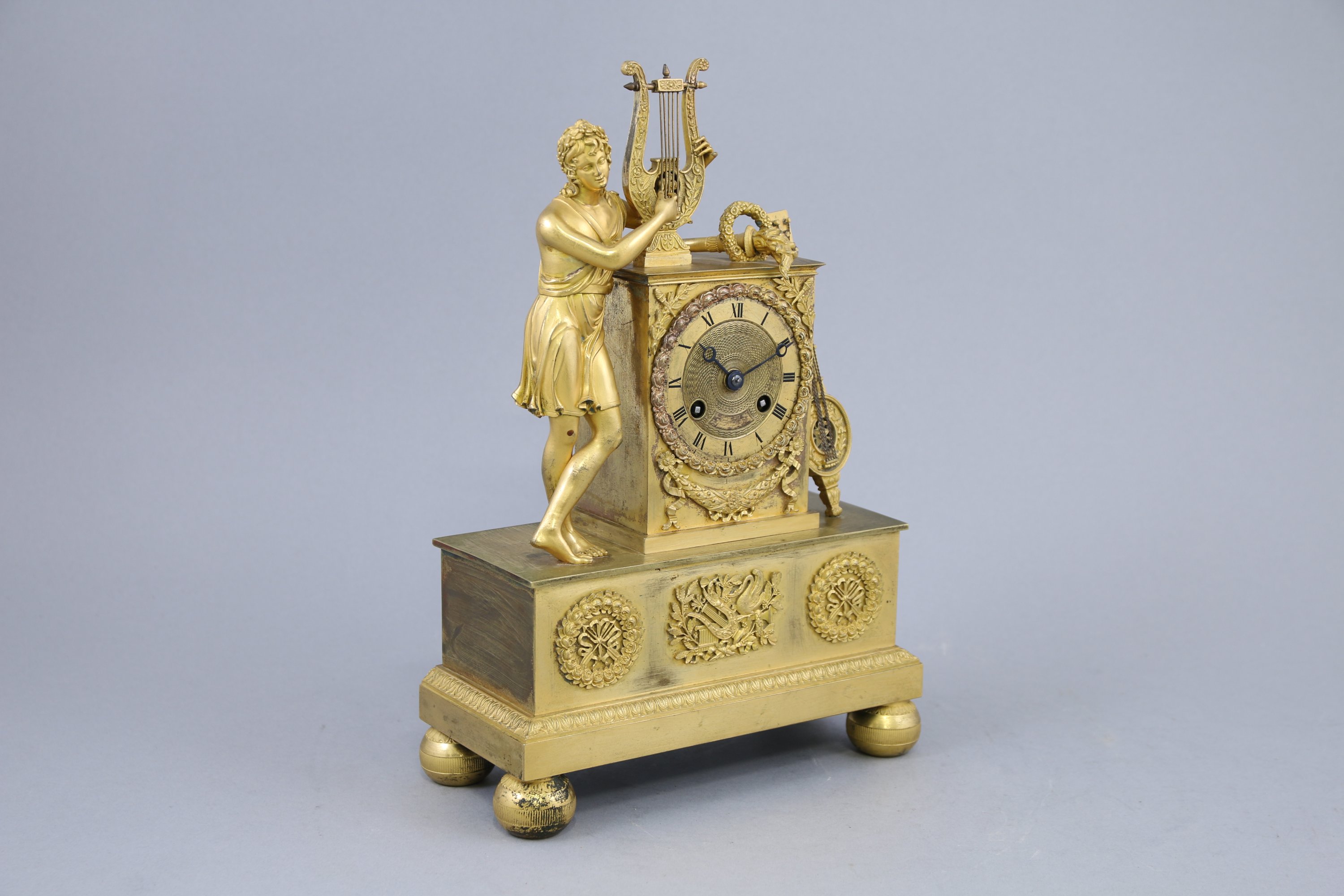 Le cadran à décor guilloché indiquant les heures en chiffres romains est inscrit dans une borne à laquelle s'accoude Apollon jouant de la harpe. La base rectangulaire à décor d'appliques aux couronnes de laurier et lyre. Quatre pieds patins.