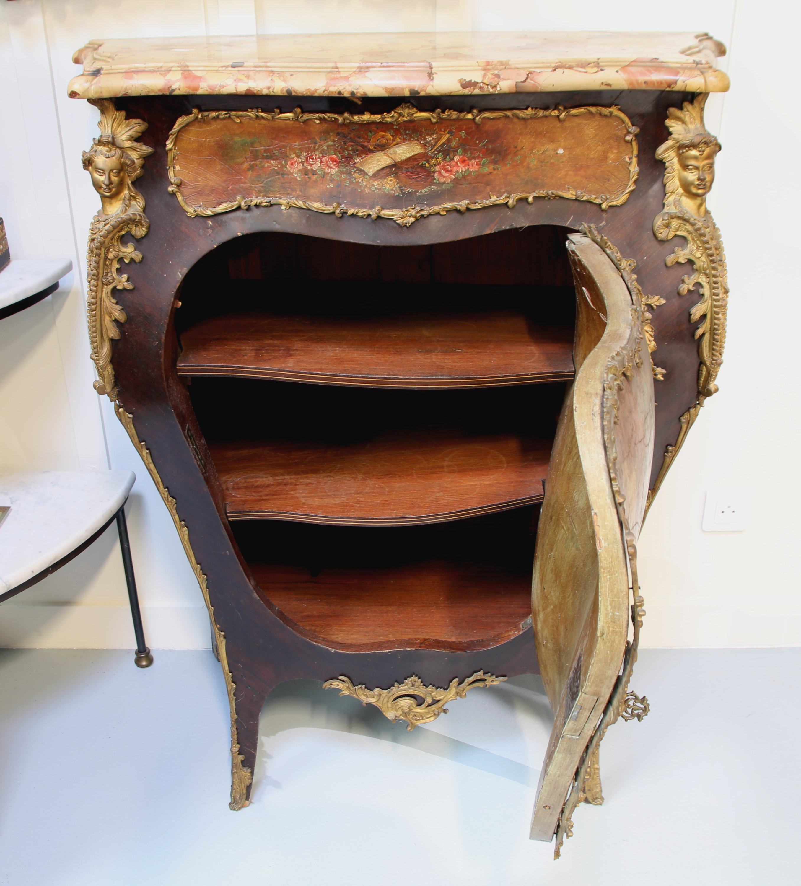 De forme bombée, il présente en façade un cartouche d'instruments de musique surmontant un vantail au décor d'une scène au couple près de l'eau.