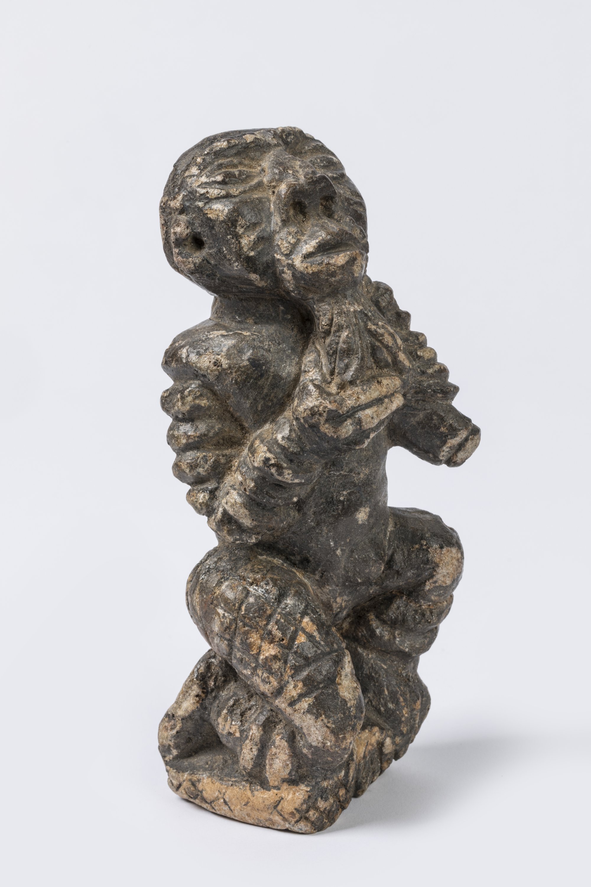 Pierre tendre sculptée, patine d'usage grisâtre.