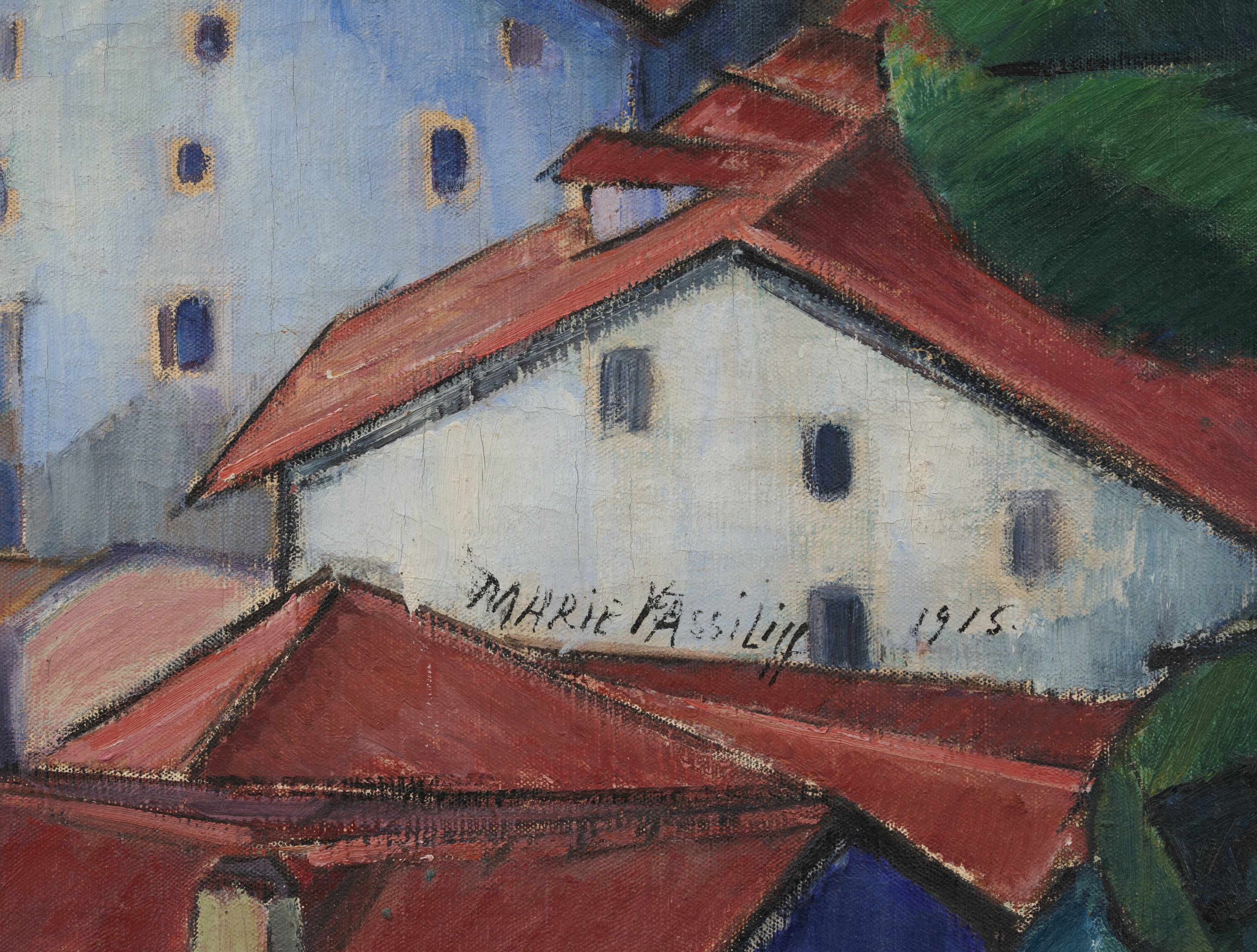 A l’été 1913, Marie Vassilieff emmène ses élèves travailler en Espagne: Fontarabie, Pasajes, Saint-Sébastien. Elle en rapporte des carnets et des toiles. Ce Paysage espagnol de 1915 en est le fruit le plus accompli. Vue plongeante sur un village: les toits se chevauchent en aplats de couleur pure, les volumes s’emboitent sans perspective classique, la géométrie s’impose. Le traitement rappelle les leçons de Cézanne digérées par le cubisme, mais la palette, chaude et franche, trahit la lumière basque et l’œil d’une coloriste formée par Matisse. L’œuvre a été exposée à Berlin en 1995, à Paris en 1998 et à la Fondation Beyeler de Riehen-Bâle en 2015 dans l’exposition consacrée à la Dernière exposition futuriste 0,10. Georges Hilaire, rendant compte de l’exposition Les Cubistes en 1973, regrettait explicitement l’absence de Vassilieff, saluant ses « compositions frémissantes de sensibilité douloureuse ». Cette toile en est l’une des preuves les plus convaincantes.