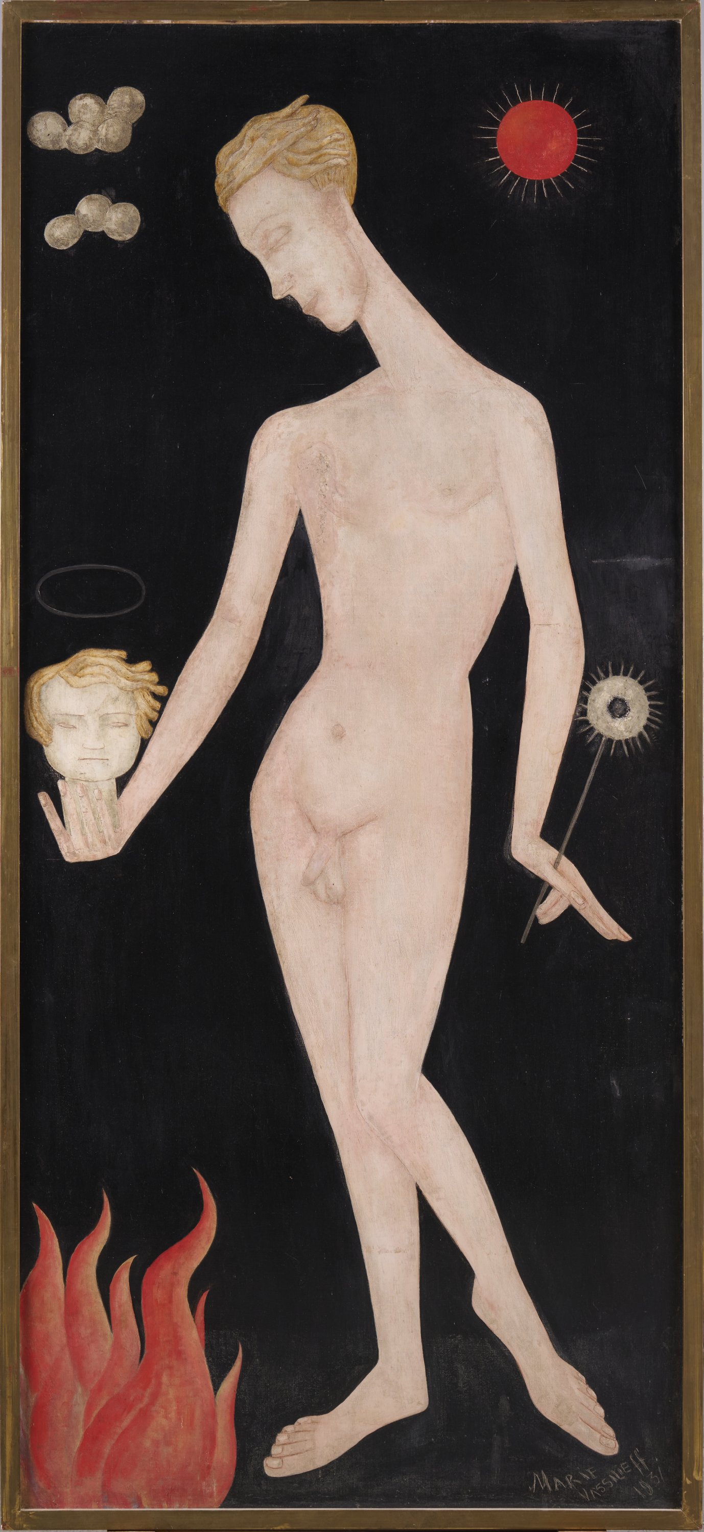 En 1931, un jeune homme de vingt-trois ans entre dans la vie de Marie Vassilieff. Eric, fils de magistrat, blond aux yeux bleus, porte une cicatrice sur le nez qui renforce son charme classique. A quarante-sept ans, Marie le considère comme un fils aîné autant qu’un modèle. Répétiteur de Pierre, elle invente des farces avec lui. Mais cette relation reste suspendue: Vassilieff ne peut se libérer de sentiments antagonistes envers l’homosexualité. Le tableau le montre debout, arborant un sexe que l’on ne peut deviner, tenant dans sa main droite une tête de femme qu’il jette dans les flammes, dans l’autre une longue fleur verte. Fond noir, soleil rouge, nuages blancs: le style évoque Cranach. Cette Moderne Salomé ne jette pas la tête du Baptiste mais celle de Marie Vassilieff elle-même. C’est le miroir exact du pendant que constituera deux ans plus tard le portrait de Juliette Germain. Exposé en 1971, le tableau figurait dans l’appartement de Claude Bernès, accroché à droite de la porte d’entrée.