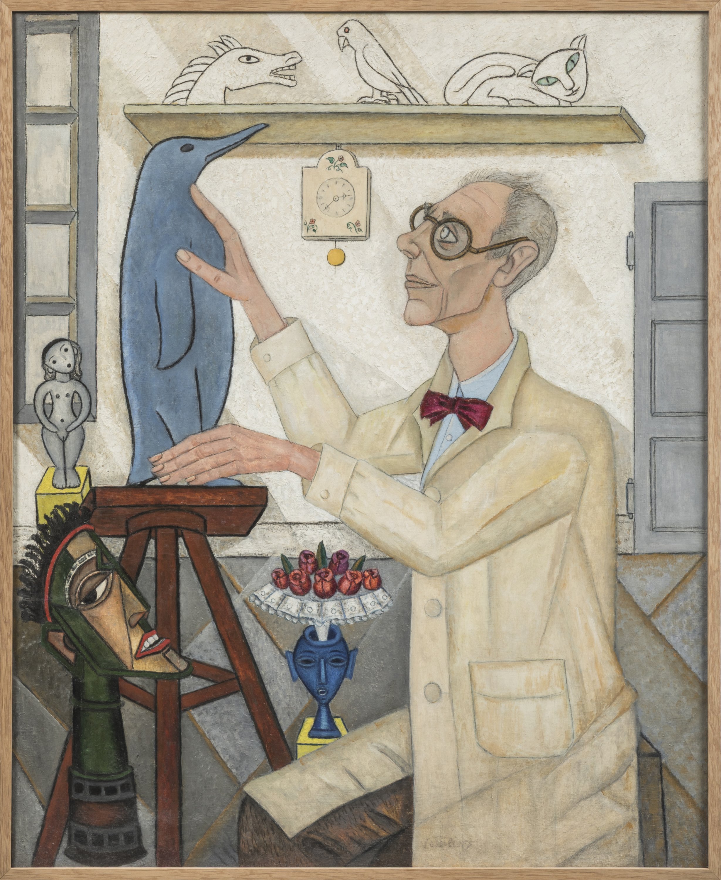Armand Petersen est l’un des compagnons de la Maison nationale des artistes de Nogent-sur-Marne, où Marie Vassilieff passe ses dernières années. Sculpteur animalier réputé, il devient l’un de ses modèles favoris. Vassilieff le représente dans son atelier entouré de ses œuvres. C’est là que le tableau révèle sa singularité: on y reconnaît son Faucon, représenté entier alors qu’il n’en sculpta qu’une tête, tandis que Vassilieff ne figure qu’une tête de cheval là où Petersen sculpta l’animal complet. Ces inversions délibérées entre le tout et la partie témoignent de la liberté avec laquelle Vassilieff traite ses modèles. C’est l’une des dernières grandes toiles de sa carrière, peinte deux ans avant sa mort, dans la sérénité retrouvée de Nogent.