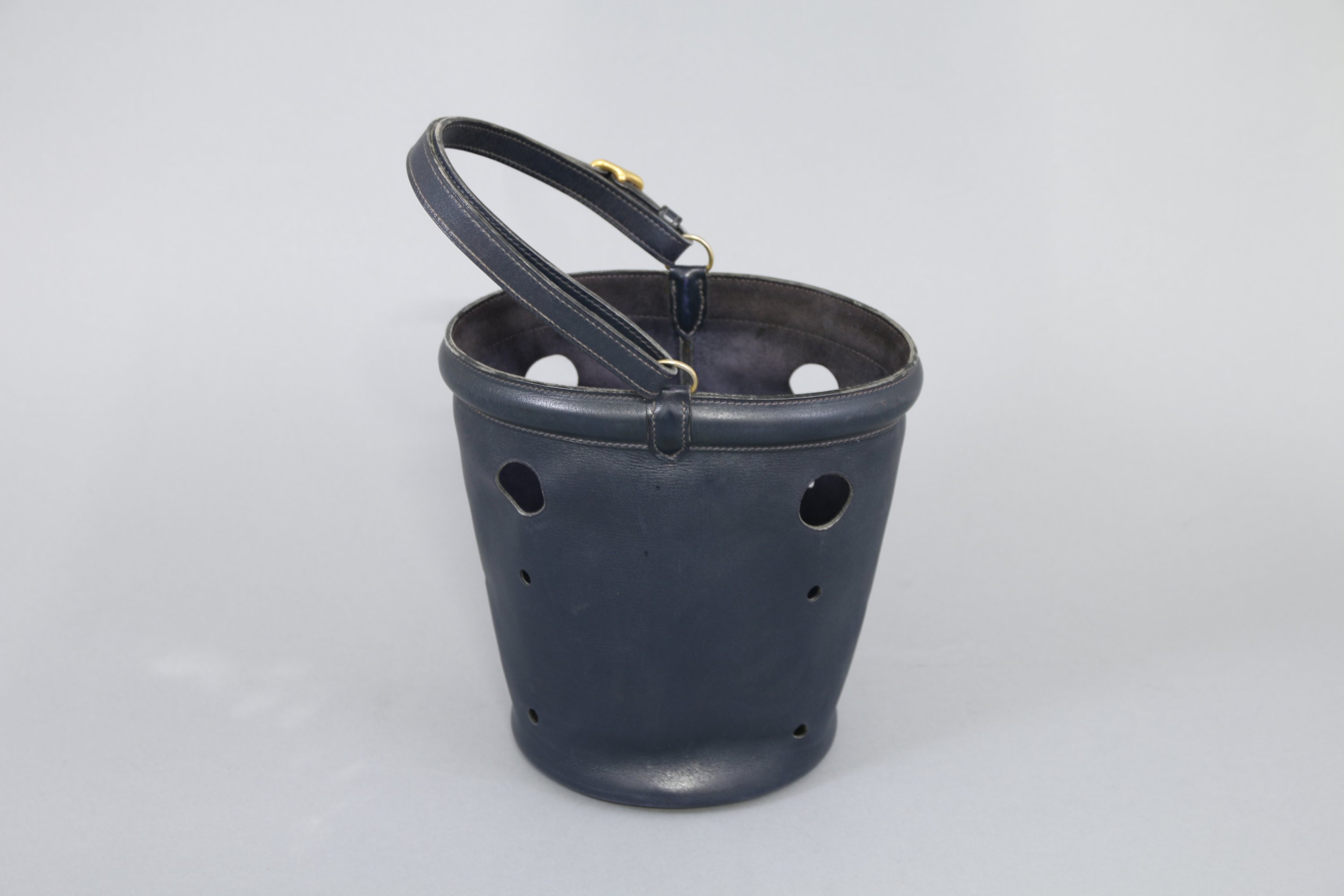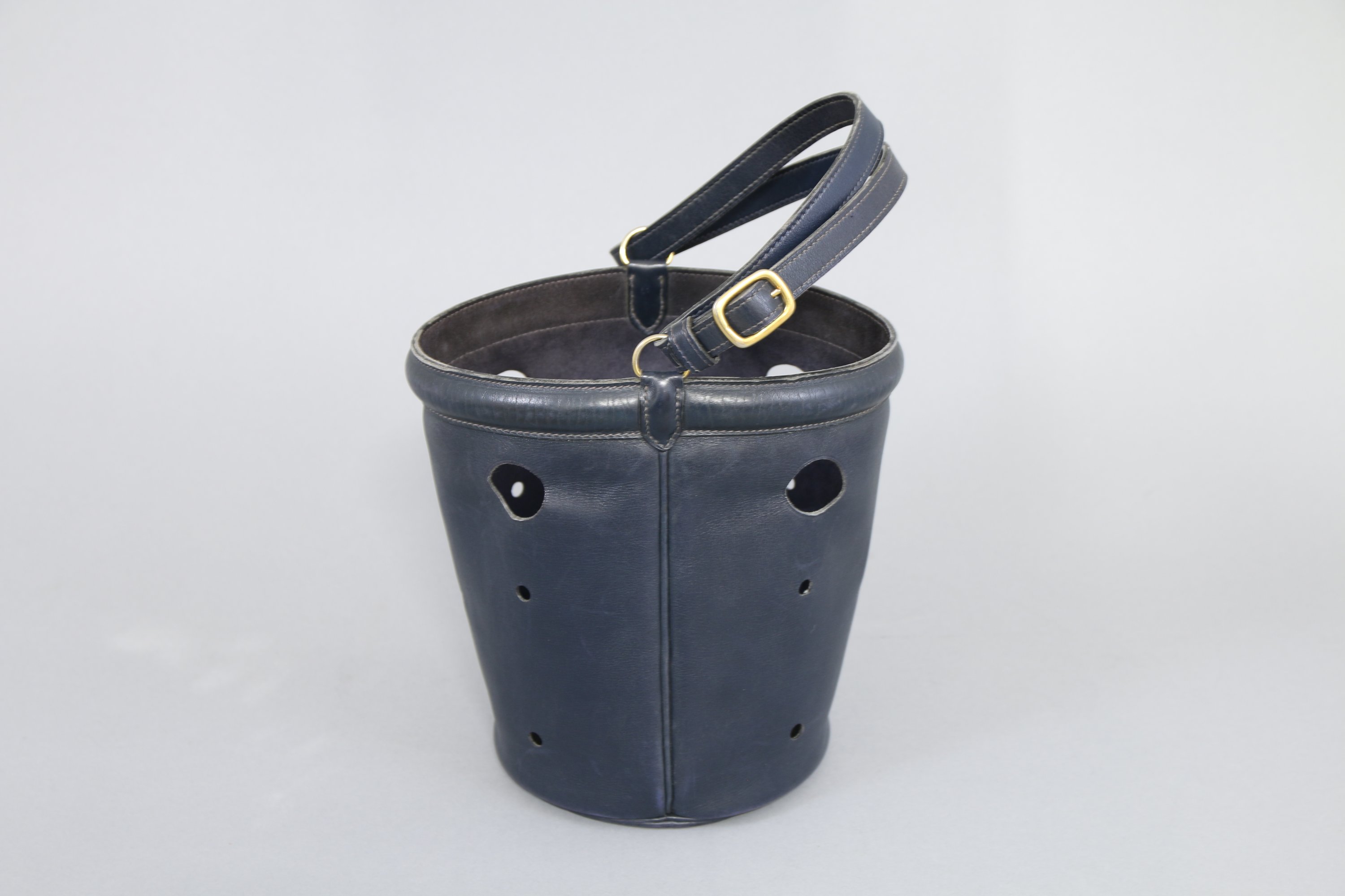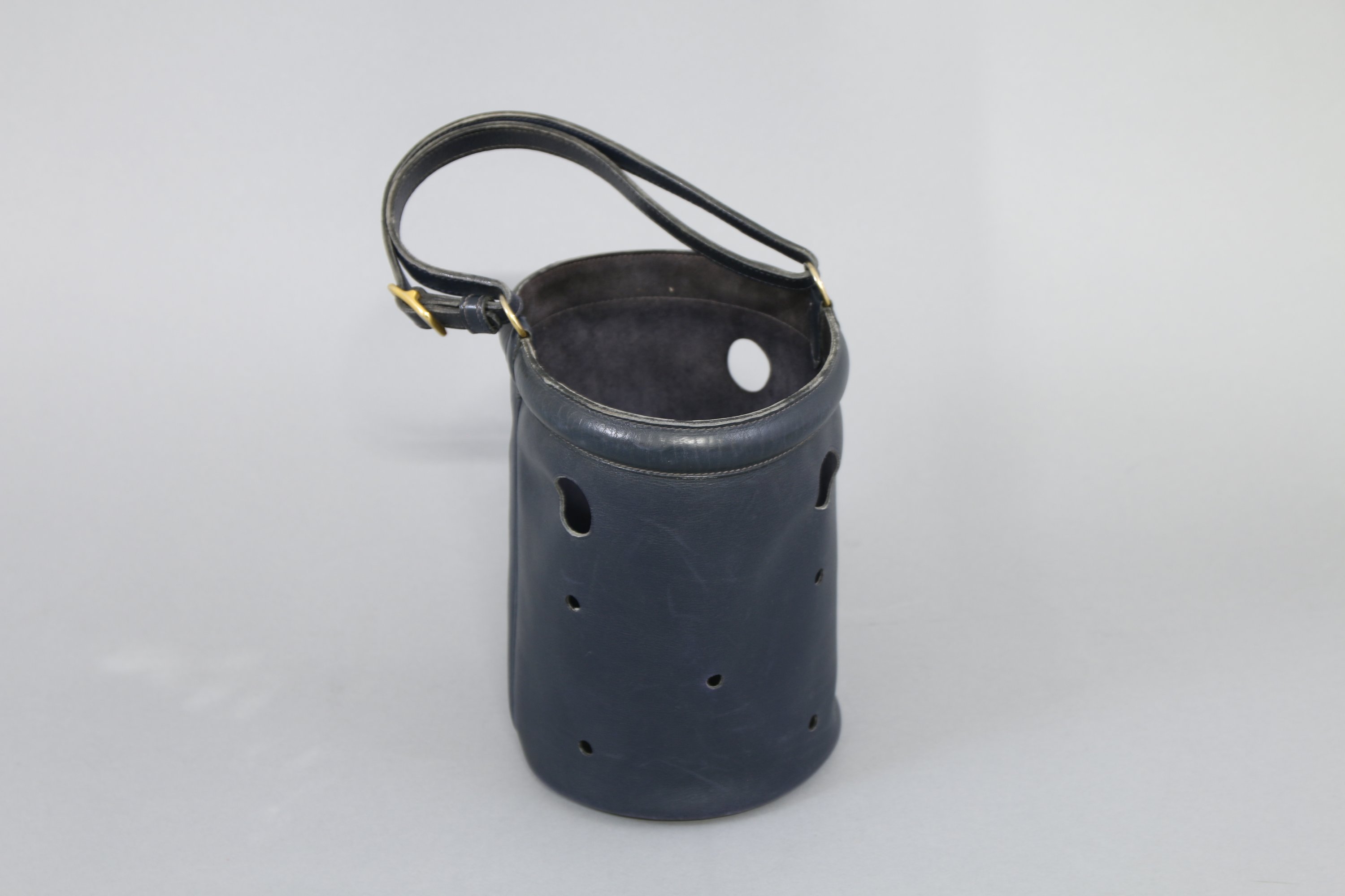 Cuir bleu repercé et bijouterie en métal doré.