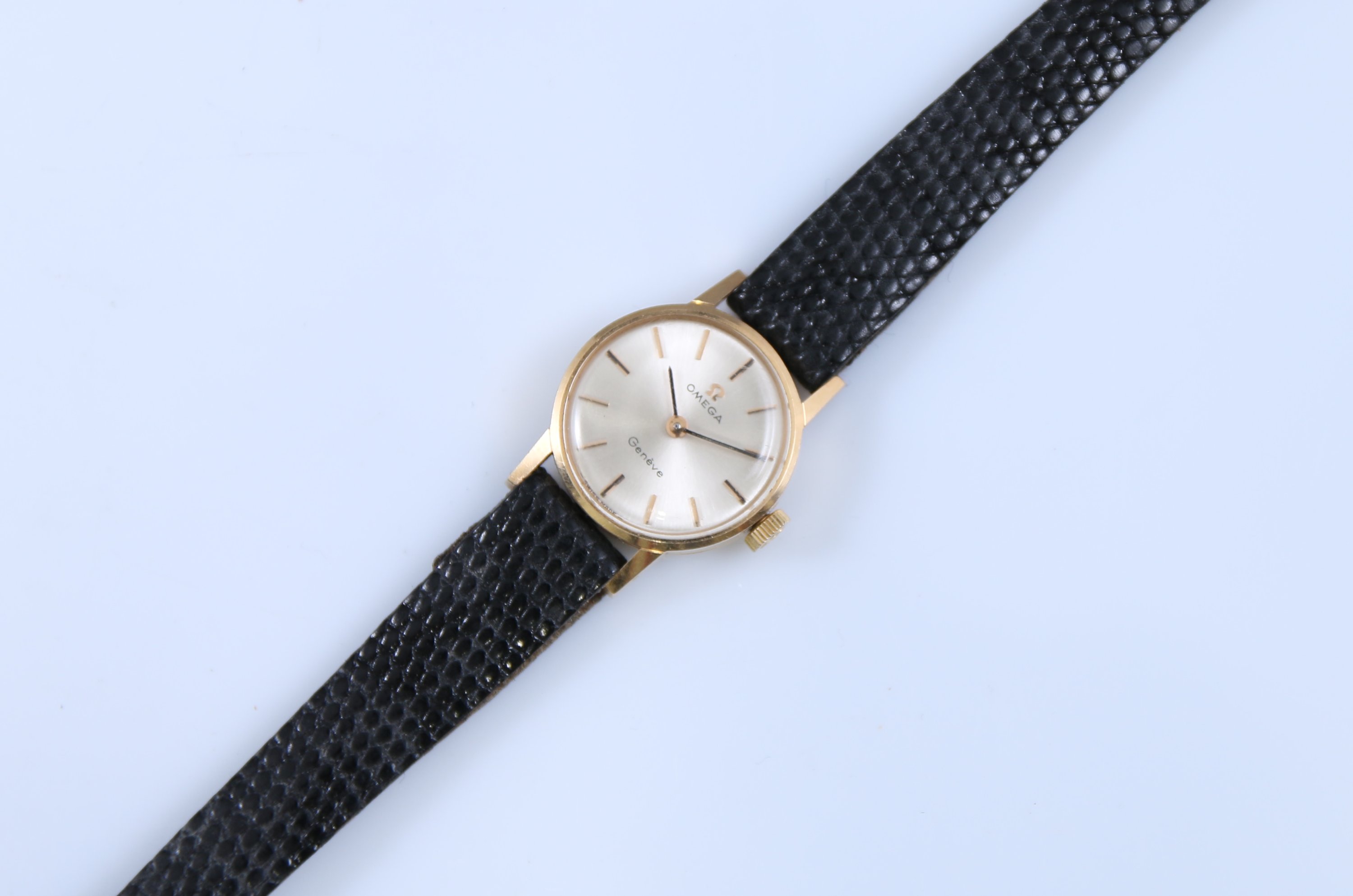Le cadran argenté indique les heures par des bâtonnets. Il est signé "Omega Genève".