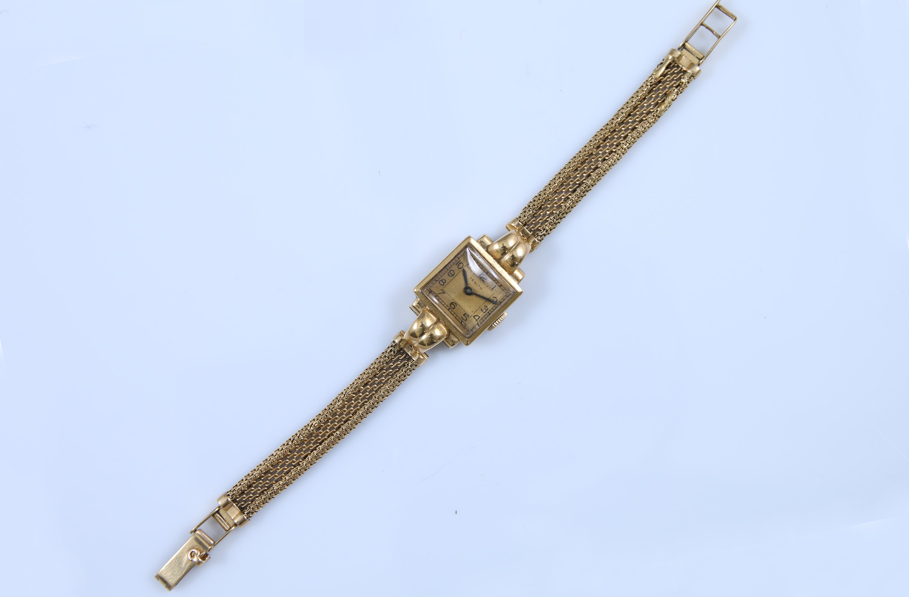 Le boitier carré au cadran champagne indiquant les heures par des chiffres arabes et minutes par un chemin de fer. Le bracelet en or jaune 750 millièmes à mailles articulées. Mouvement mécanique. Numérotée au revers du boitier "36620".