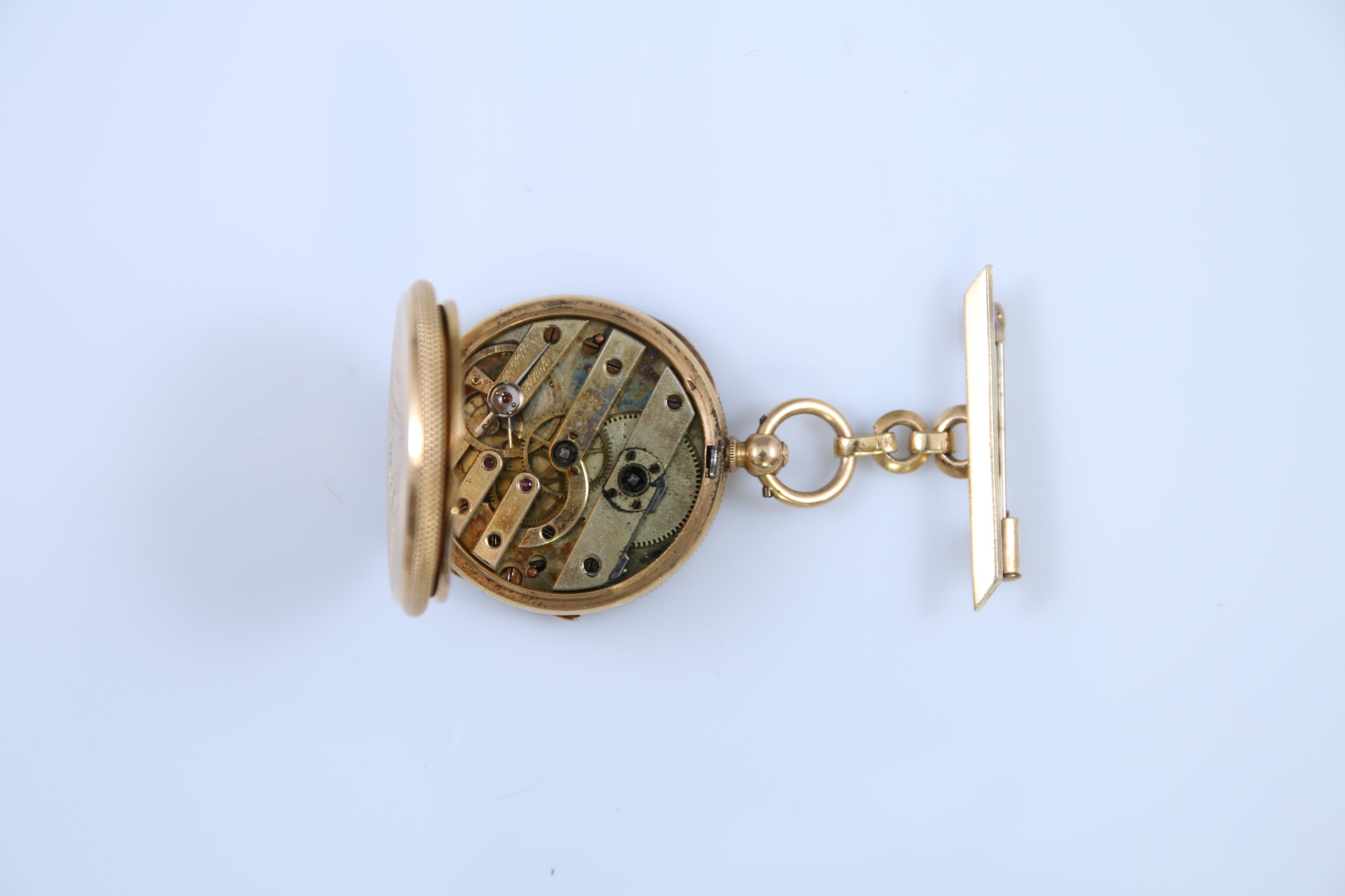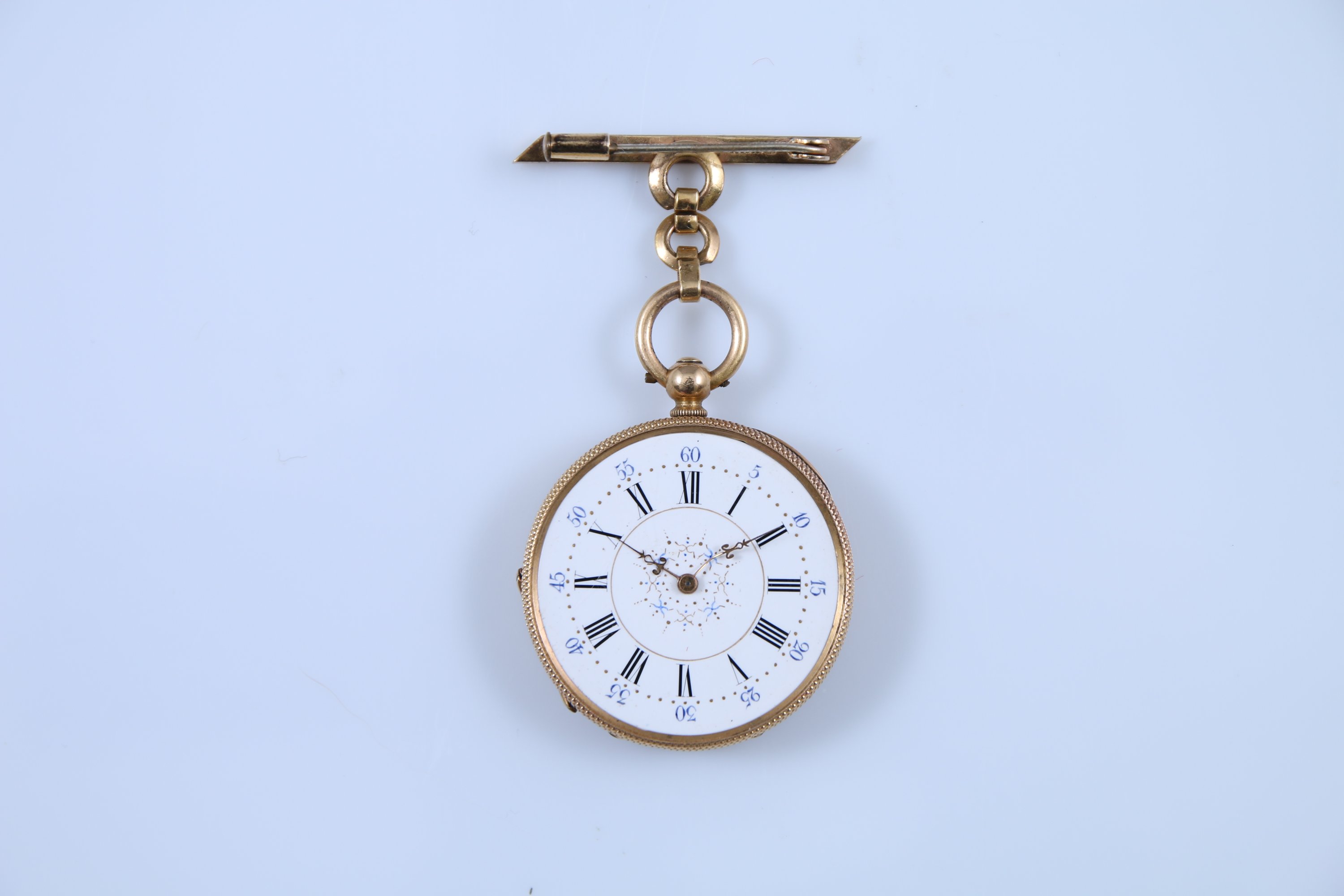 Le cadran émaillé blanc indiquant les heures en chiffres romains, les minutes par des pointillets et chiffres arabes. Le revers à décor guilloché entourant un cuir. L'intérieur marqué "cylindre huit rubis / Sidonnie Desffressine / à Cluis 1877".