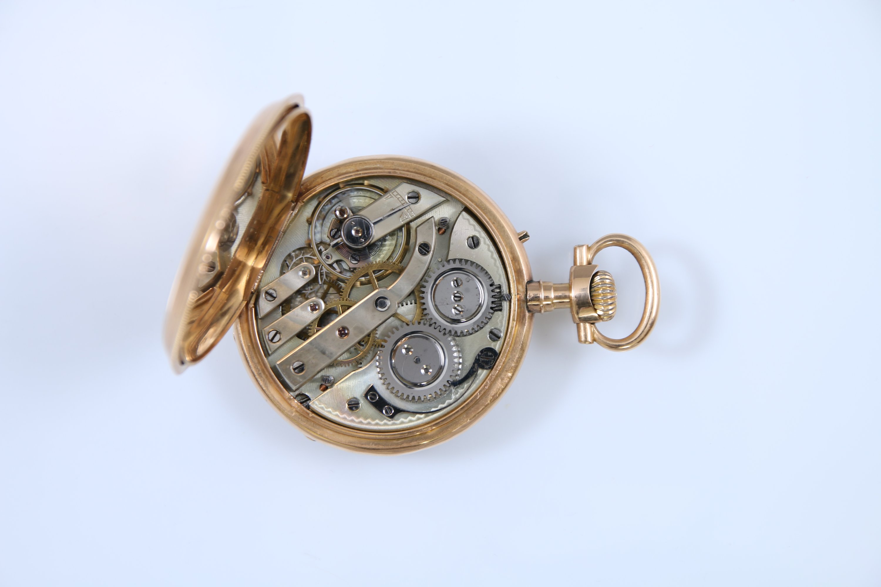 Cadran émaillé blanc indiquant les heures en chiffres romains et les minutes par un de fer. Petite trotteuse à six heures. Cache-poussière en or jaune 750 millièmes marqué "Remontoi / nickel / Ancre ligne droite / Spiral Breguet / 15 rubis / Genève" et numéroté "79 938".