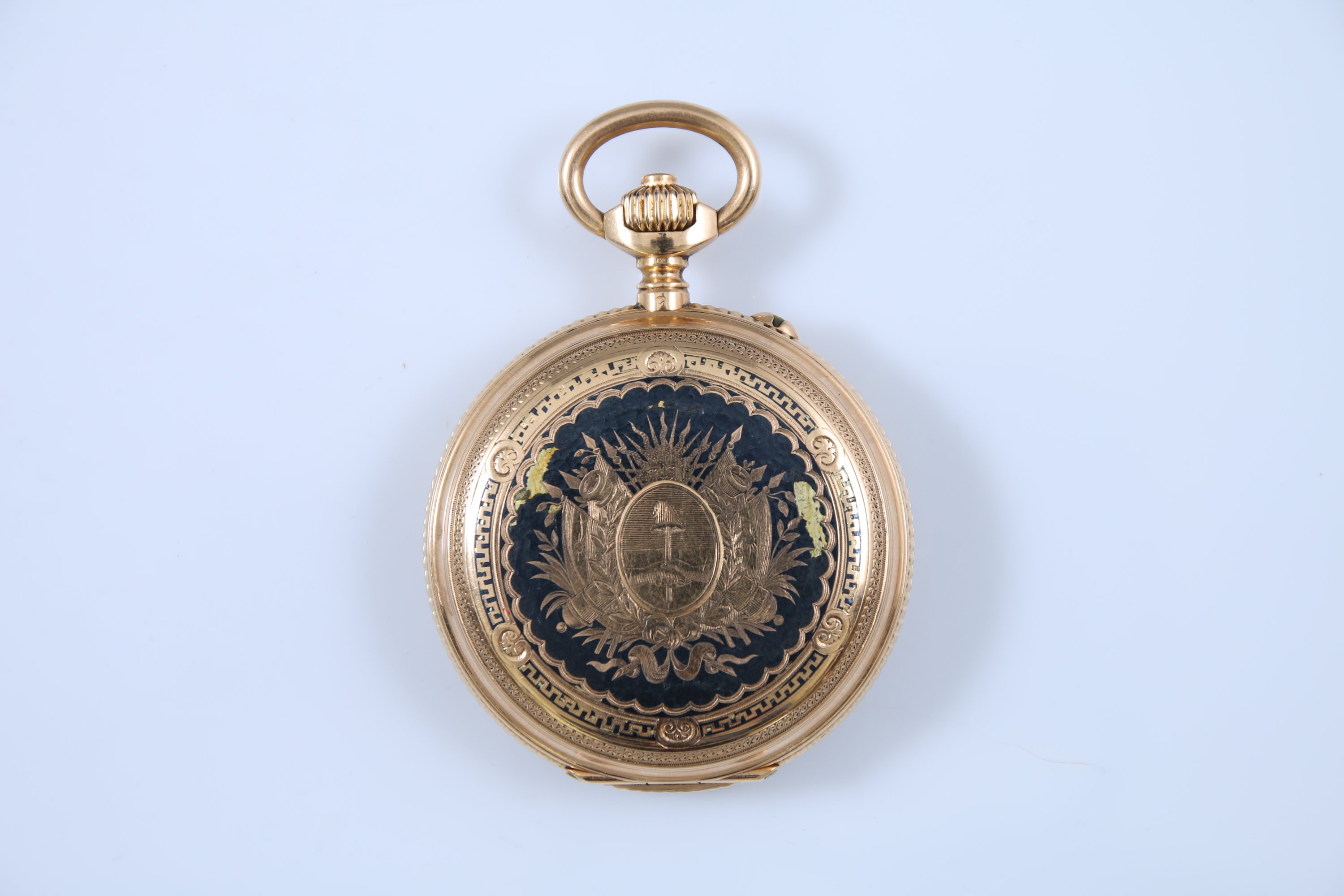 Le boitier décoré à l'avers d'un bonnet dans un entourage de trophée d'armes et frise de grecques, et le revers d'un chasseur et son chien. Le cadran émaillé blanc indiquant les heures en chiffres romains, les minutes par un chemin de fer. Petite trotteuse à 6 heures. Le cache poussière gravé "échappement à ancre / ligne droite / 20 rubis balancier / compensateur".
