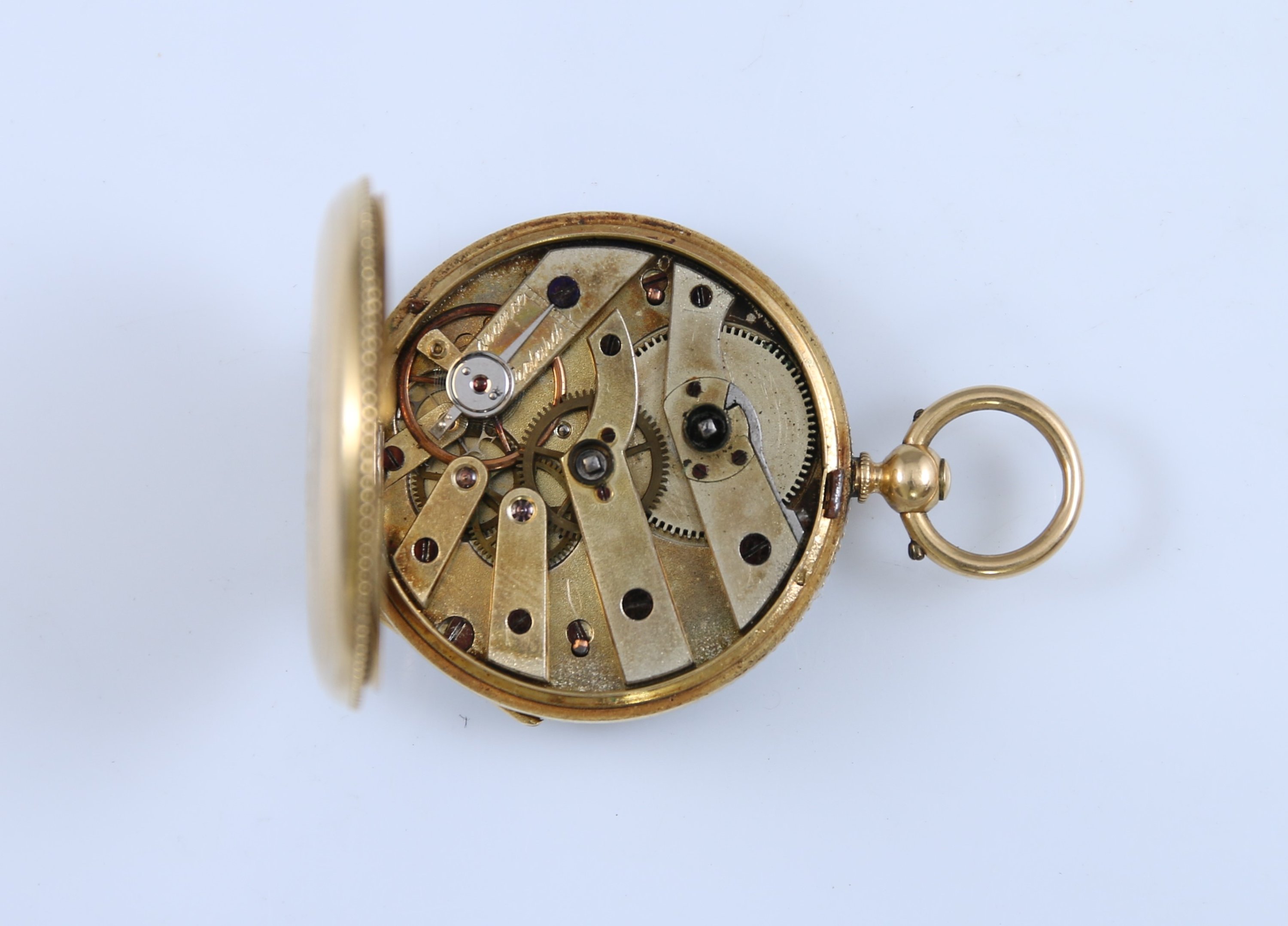 Cadran émaillé blanc indiquant les heures en chiffres romains. Le revers du boitier monogrammé "LA" sur fond guilloché. Cache-poussière en or jaune 750 millièmes. Bélière.