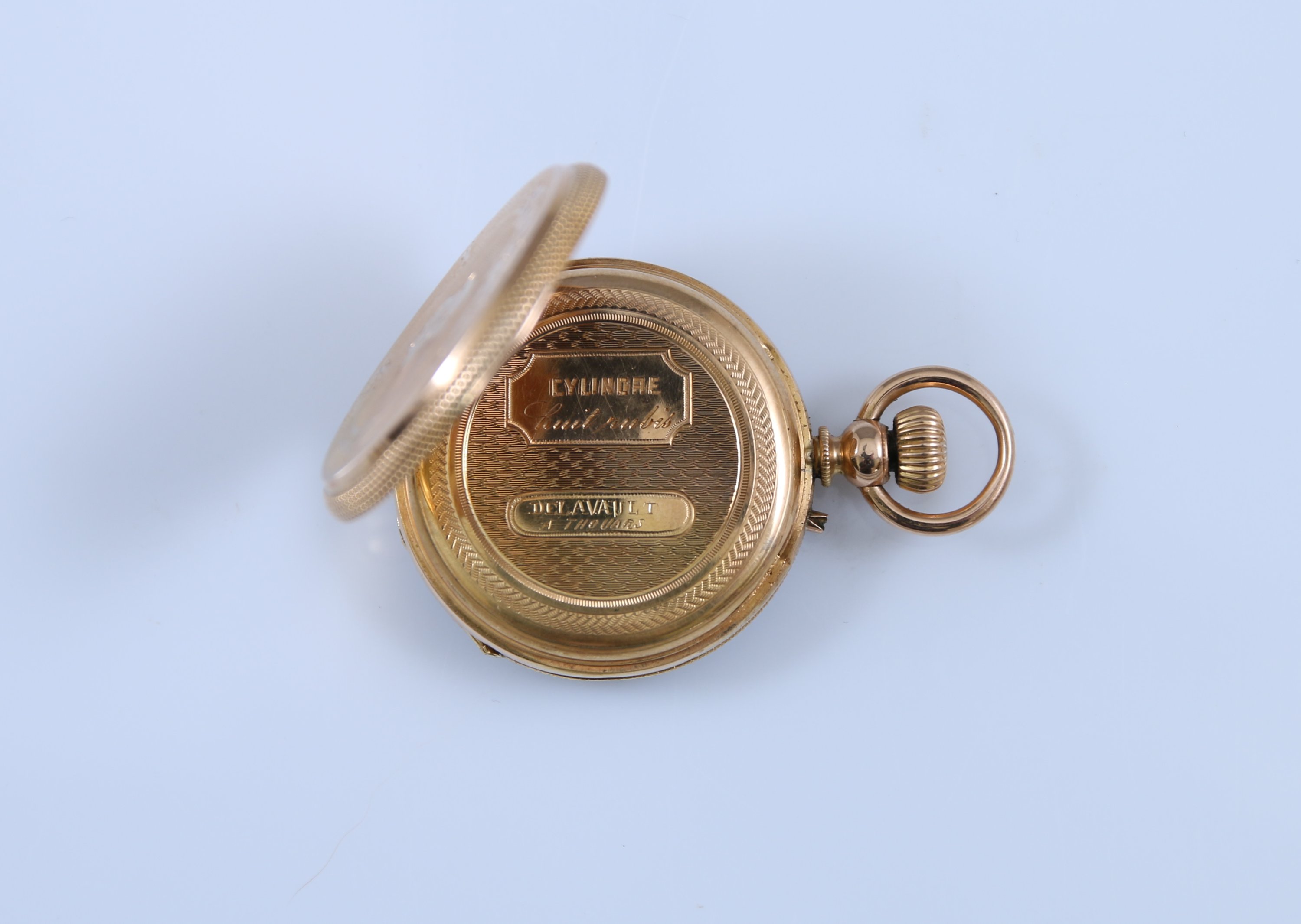 Le cadran émaillé blanc indique les heures en chiffres romains et les minutes en chiffres arabes. Boitier guilloché à décor de fleurs et monogrammé '"HL"