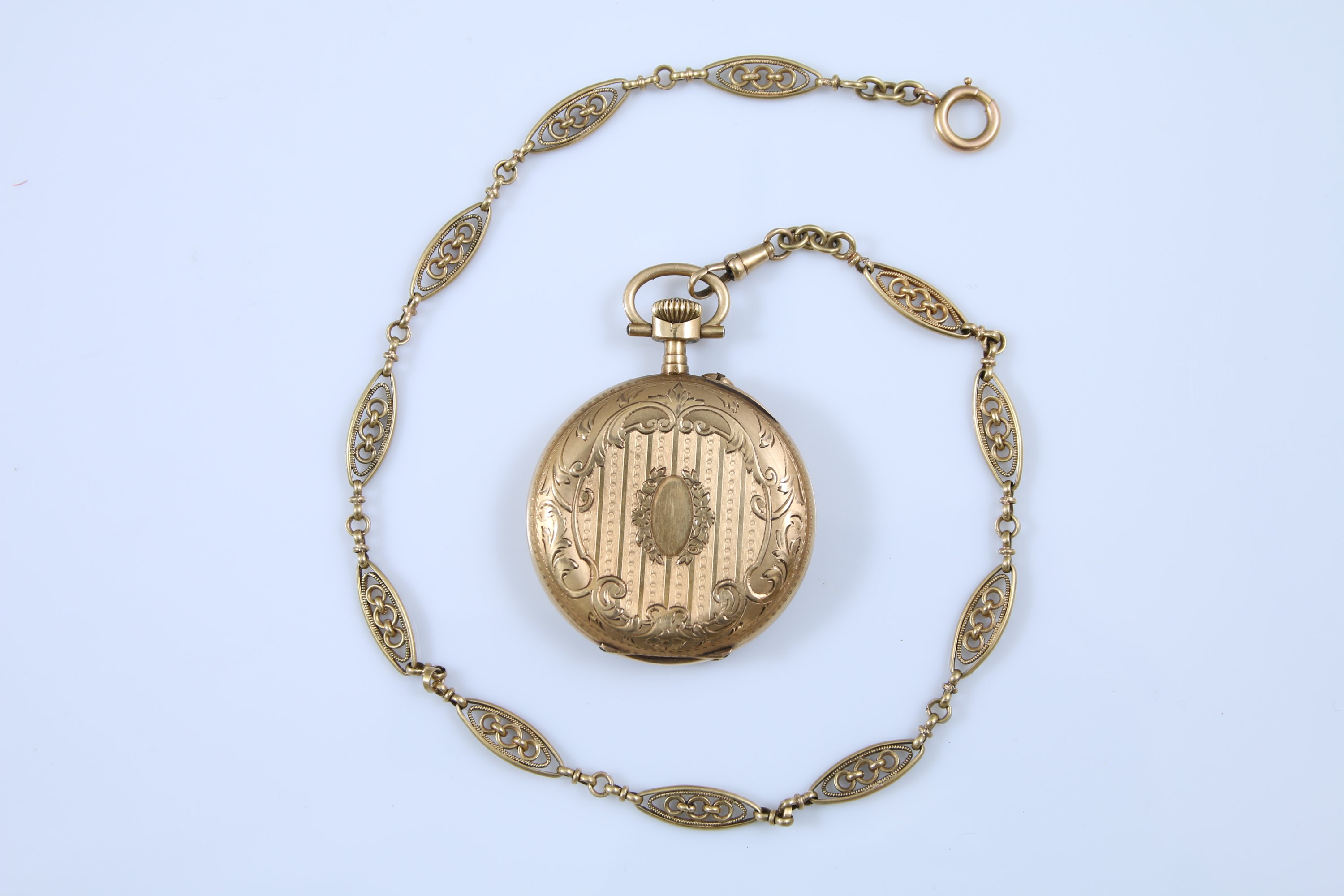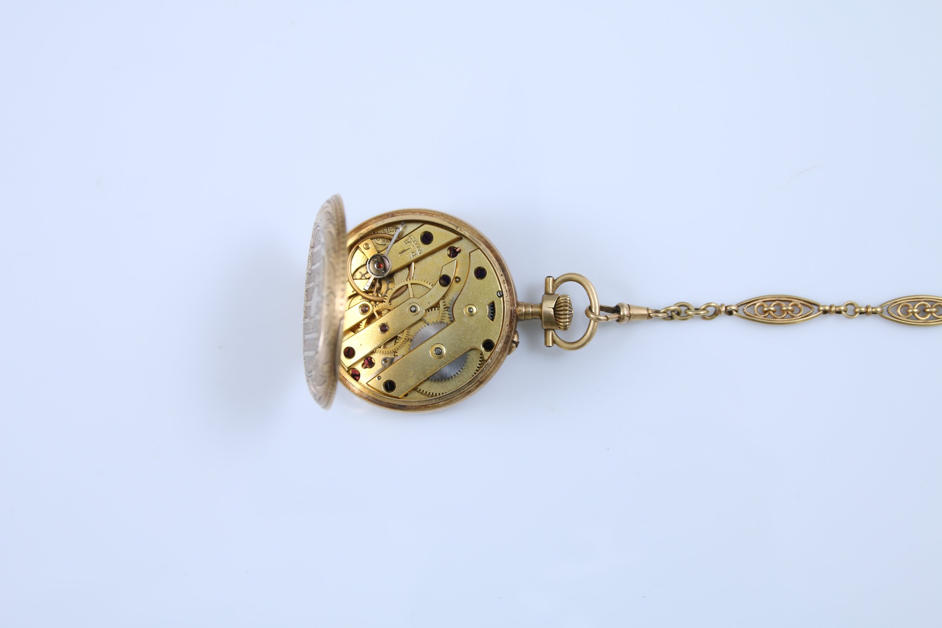 La montre au cadran émaillé blanc indiquant les heures en chiffres romains, les minutes par des pointillets et chiffres arabes. Remontoir à 12 heures. Bélière. Le revers du boitier à décor d'un médaillon dans un entourage de rinceaux. Cache-poussière intérieur en or.
