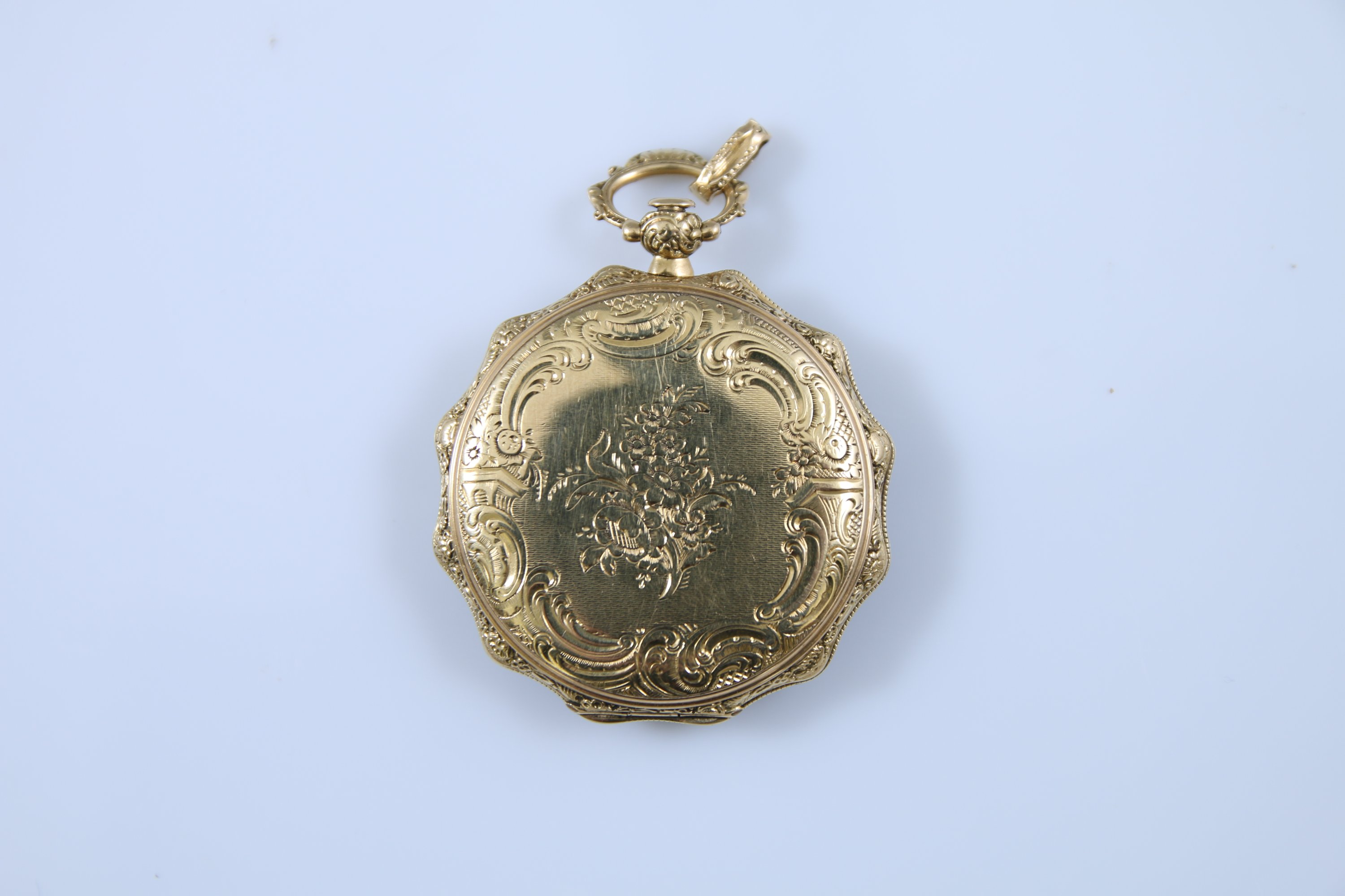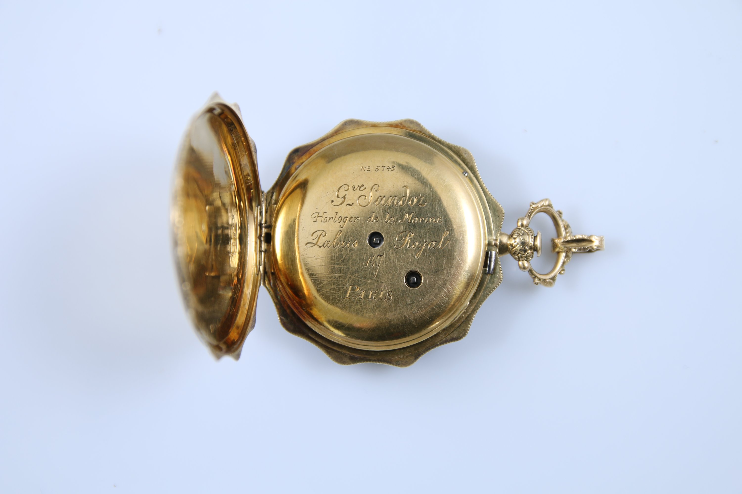 Le cadran en argent gravé de fleurs avec les heures en chiffres romain. Le cache-poussière en or jaune gravé "Gv Sandoz Horloger de la Marine Palais Royal 147 Paris", numéroté "5743".