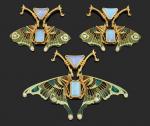 René Lalique (1860-1945), set of three butterfly motifs, circa 1900, yellow gold, plique-à-jour polychrome enamel, round old-cut diamonds, cabochon-set opals, signed on each motif, h. 11.5 et 7 cm/4.52 x 2.75 in.
