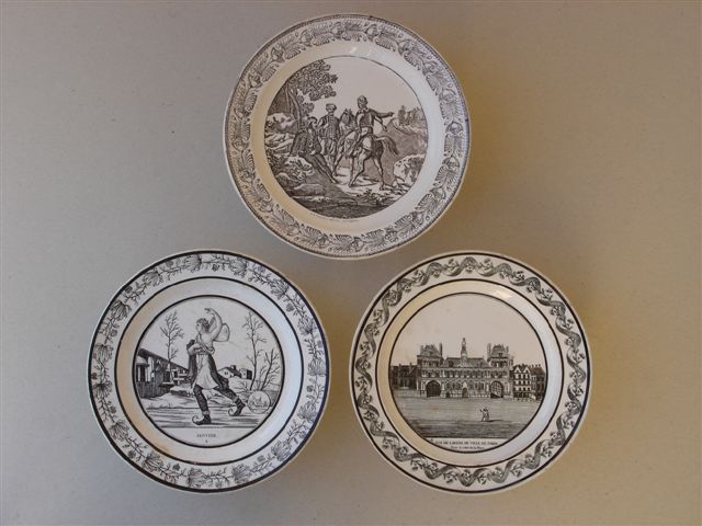 CHOISY et MONTEREAU - 3 ASSIETTES en faïence fine. Décors imprimés en noir de l'Hôtel de Ville de Paris, du mois de Janvier, et de la veille d'une attaque. Marques en creux P & H CHOISY pour deux assiettes et LL &T (Montereau, 1825-1833) pour une assiette.