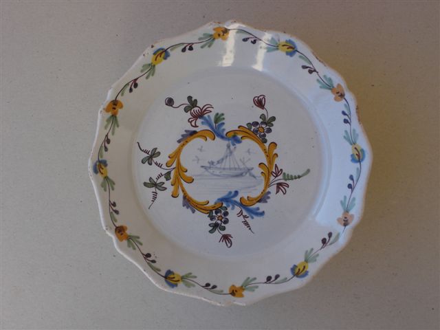 LA ROCHELLE - ASSIETTE en faïence de grand feu. Décor polychrome d'un navire en grisaille dans un cartouche rocaille jaune entouré de fleurs de style Louis XV. Aile chantournée peinte d'une guirlande de fleurs en couronne.