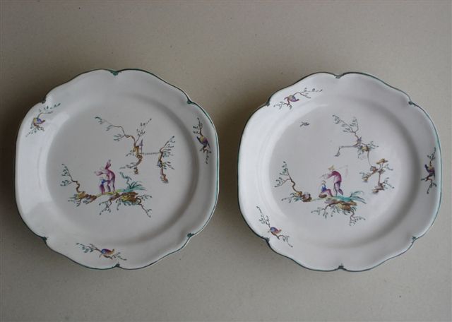 MARSEILLE - Veuve PERRIN. Paire de PLATS en faïence de petit feu. Fin décor polychrome "au chinois" d'après les gravures de Pillement. Aile chantournée, bordure à liseré vert et noir. Non marqués.