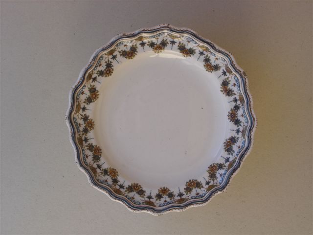 MOUSTIERS - Fabrique OLERYS-LAUGIER. ASSIETTE en faïence de grand feu à bord ondulant. Décor polychrome de guirlandes sur l'aile.