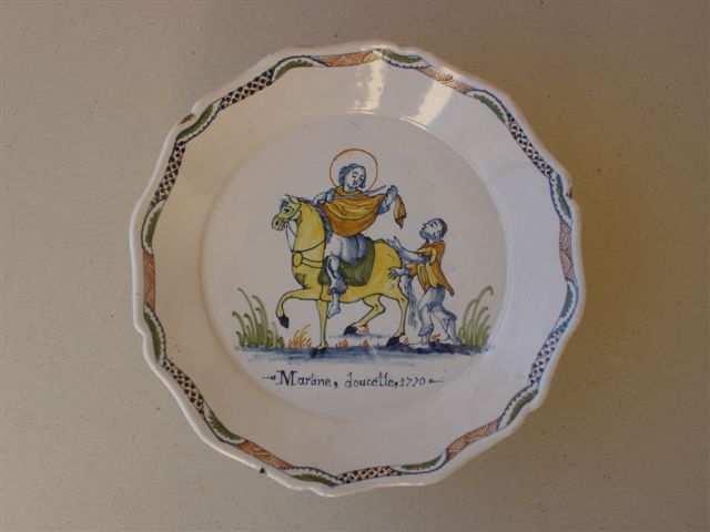 NEVERS - ASSIETTE patronymique en faïence de grand feu au nom de "Martine, Doucette, 1770". Décor polychrome représentant Saint Martin, soldat puis Evêque de Tours en 371, partageant son manteau en deux pour le donner à un pauvre. Aile chantournée ornée d'une frise en bordure.