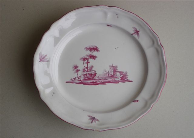 NIDERVILLER - CUSTINE. PLAT rond en faïence de petit feu. Décor en camaïeu pourpre finement peint d'un paysage au centre et d'insectes sur l'aile mouvementée. Marque du Comte de Custine au revers.