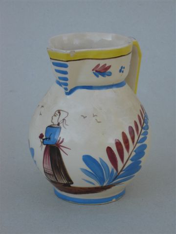 QUIMPER - PICHET ventru en faïence à décor polychrome d'une bretonne entre deux larges feuilles stylisées. Marqué HB Quimper.