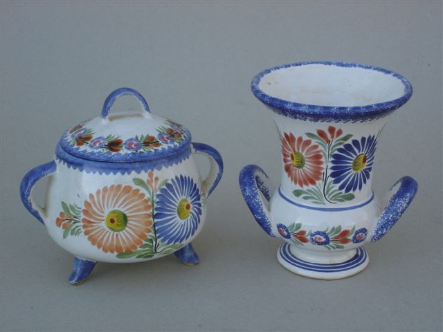 QUIMPER - VASE évasé et petite SOUPIÈRE tripode en faïence à décor polychrome floral. Bordure et anses bleu à l'éponge. Marqués Henriot Quimper France.