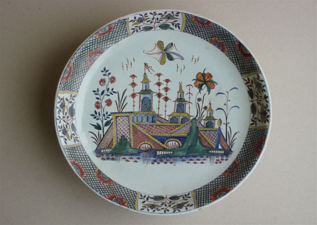 ROUEN - PLAT en faïence de grand feu. Décor d'un paysage fleuri aux trois pagodes. Aile quadrillée de vert à décor en réserve de fleurs stylisées dans le goût "de la famille verte".