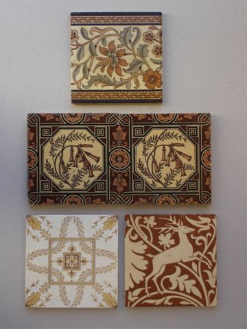 MINTON - 5 CARREAUX en faïence imprimée : paire à décor de fleurs dans un entrelac octogonal sur fond brun ; cerf ; frise florale et décor stylisé. Marqués.