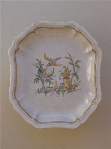 PLAT rectangulaire creux en faïence de grand feu. Décor polychrome d'oiseaux, dans un parc paysagé. Bordure à contours.