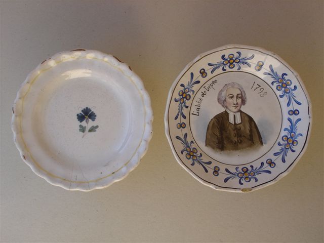 Deux ASSIETTES en faïence de grand feu. L'une à décor d'une fleur au centre, à aile ondulée. L'autre à décor peint du portrait de "L'abbé de l'Epée 1793", aile chantournée peinte de fleurs stylisées.